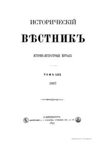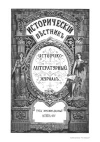«Исторический вестник» - русский ежемесячный историко-литературный журнал. Издавался в Санкт-Петербурге с 1880-го по 1917 г. Журнал был основан А.С. Сувориным и С.Н. Шубинским с целью «знакомить читателей в живой, общедоступной форме с современным состоянием исторической науки и литературы в России и Европе». Вышло 150 тт. Каждый том состоял из трёх ежемесячных выпусков, имел свою нумерацию страниц, оглавление, список иллюстраций. Журнал приобрёл устойчивую популярность среди читателей, заняв прочное место в «триумвирате» русских исторических журналов наряду с «Русским архивом» и «Русской стариной». опережая их по количеству подписчиков. Отличием «Исторического вестника» было то, что он не помещал на своих страницах необработанных, сырых материалов. С другой стороны, журнал приближался по своему типу к журналам общелитературного образца, сочетая в себе коммерческий успех и доступное изложение материала.