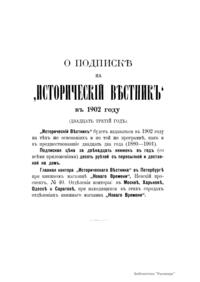 «Исторический вестник» - русский ежемесячный историко-литературный журнал. Издавался в Санкт-Петербурге с 1880-го по 1917 г. Журнал был основан А.С. Сувориным и С.Н. Шубинским с целью «знакомить читателей в живой, общедоступной форме с современным состоянием исторической науки и литературы в России и Европе». Вышло 150 тт. Каждый том состоял из трёх ежемесячных выпусков, имел свою нумерацию страниц, оглавление, список иллюстраций. Журнал приобрёл устойчивую популярность среди читателей, заняв прочное место в «триумвирате» русских исторических журналов наряду с «Русским архивом» и «Русской стариной». опережая их по количеству подписчиков. Отличием «Исторического вестника» было то, что он не помещал на своих страницах необработанных, сырых материалов. С другой стороны, журнал приближался по своему типу к журналам общелитературного образца, сочетая в себе коммерческий успех и доступное изложение материала.