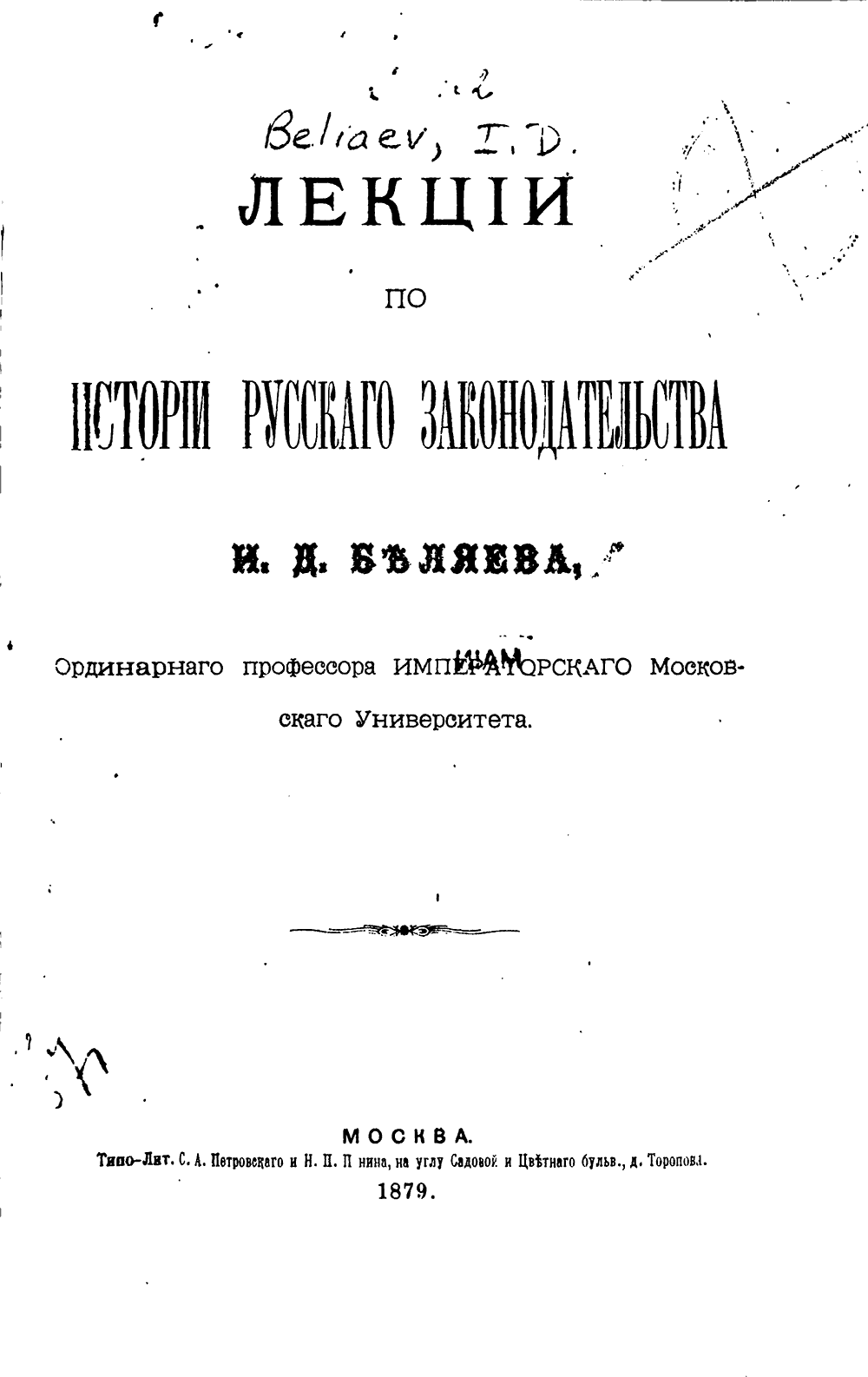 «Лекции по истории русского законодательства», И. Д. Беляева, ординарного профессорам Московского университета. М., 1879.