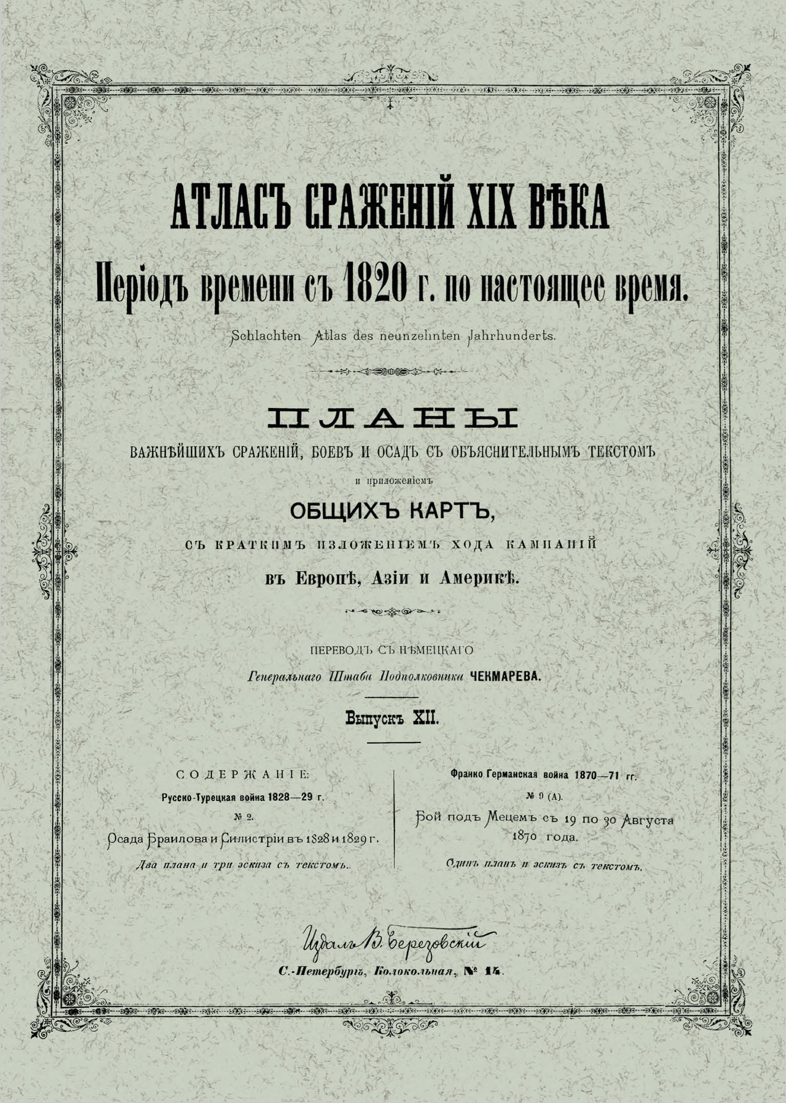 Второе издание «Атласа сражений XIX века» в 20-ти выпусках, представляет собой перевод на русский язык, выпускавшегося в военно-научном комитете Главного штаба на немецком языке с 1830-х гг., разрозненного собрания карт и планов военных кампаний армий мира в XIX века. Переводчиком данного издания является Виктор Иванович Чекмарев (1861–1939) — генерал-лейтенант (1912), видный военный деятель российской императорской армии, историк, участник Первой мировой войны и белого движения на юге России, впоследствии в эмиграции. С 1894 г., занимая должность делопроизводителя, а затем столоначальника канцелярии военно-ученого комитета Главного Штаба, подполковник Генерального Штаба Чекмарев, в результате кропотливой работы собрал воедино «Атлас сражений XIX века», каждый выпуск которого посвящен одной или нескольким военным кампаниям Европы, Азии и Америки, содержит подробное описание расположения войск и хода боевых действий противников, хронологию событий, снабжен картами и планами сражений. Это издание имеет большую историко-культурную ценность, интересно как ученым-историкам, так и любителям военно-исторической литературы.