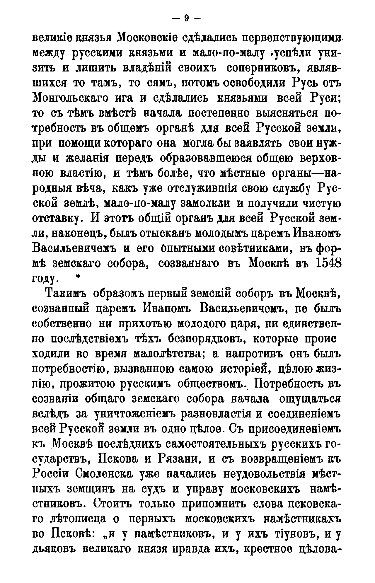 Профессор Императорского Московского университета Иван Дмитриевич Беляев, изучив историю Земских соборов, на которых рассматривались важнейшие государственные вопросы, делает вывод о том, что ни один собор на Руси не был созван не по воле царя. Но эта воля была не произволом той или иной царственной личности, а только «исторической формой» – история работала, закладывала семя, а жизнь это семя растила, и из него вырастал плод, который являлся неотложным поводом к созыву земского собора. Так, Петр Великий почти тридцать лет без устали работал над тем, чтобы Екатерина Великая через сорок лет после его кончины созвала земский собор в Москве. В то же время русская земля никогда не требовала земских соборов, а всегда считала только своей повинностью высылать своих представителей на собор, когда царь потребует этой повинности. Это, по мнению автора, завет наших предков потомкам, повторяемый более трёхсот лет.