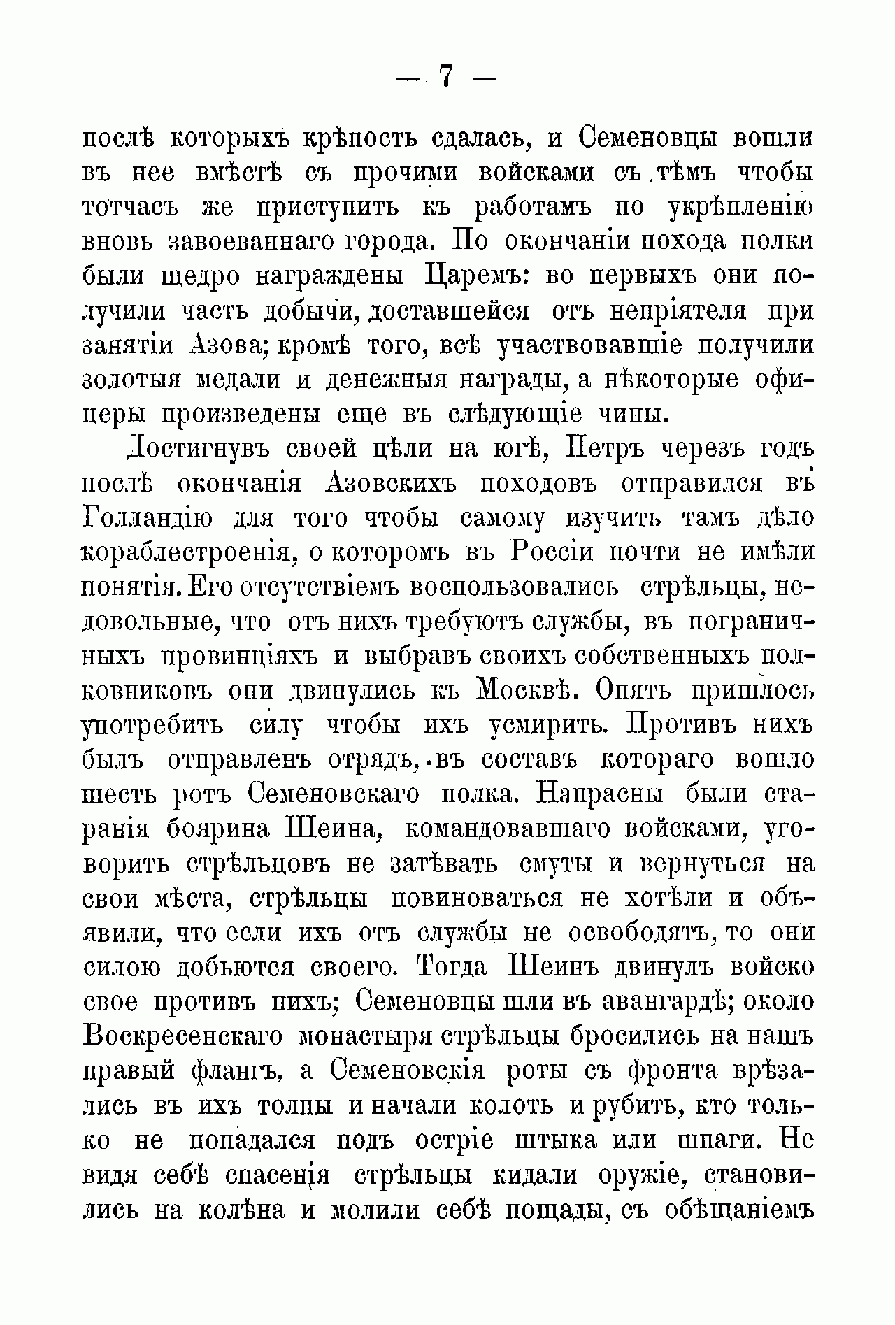 В этой брошюре бегло излагается боевой путь прославленного полка с момента его создания до начала царствования Александра III. Один из двух старейших пехотных полков гвардии (наряду с лейб-гвардии Преображенским полком), ведёт свою историю с 1683 г., с «потешных войск» царя Петра I. В 1700 г. он получил наименование лейб-гвардии Семёновский (по подмосковному дворцовому селу Семёновское, где первоначально дислоцировался). Полк участвовал в Азовских (1695–1696) и Прутском (1711) походах, всех важнейших сражениях Северной войны (1700–1721), в том числе и морских, при Гангуте (1714) и Гренгаме (1720). А также в Персидском походе (1722–1723 гг.), а отдельные его подразделения - в войне с Турцией (1735-1739 гг.) и двух войнах со Швецией (1741-1743 и 1788-1790 гг.). В XIX в. полк участвовал в войнах с наполеоновской Францией (1805–1807 гг.), Отечественной войне 1812 года, в заграничных походах русской армии (1813–1814 гг.), и, наконец, в русско-турецких войнах (1828-1829 и 1877–1878 гг.).