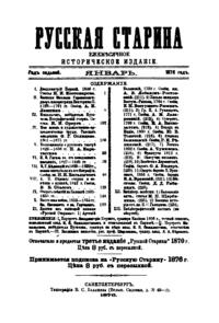 «Русская старина», ежемесячный исторический журнал, выходил в Петербурге в 1870-1918. Основан, издавался и редактировался (1870-1892) М. И. Семевским при участии В. И. Семевского. Последующими редакторами были Н. К. Шильдер (1892-1896), Н. Ф. Дубровин (1896-1904), военные историки С. П. Зыков, П. Н. Воронов.
