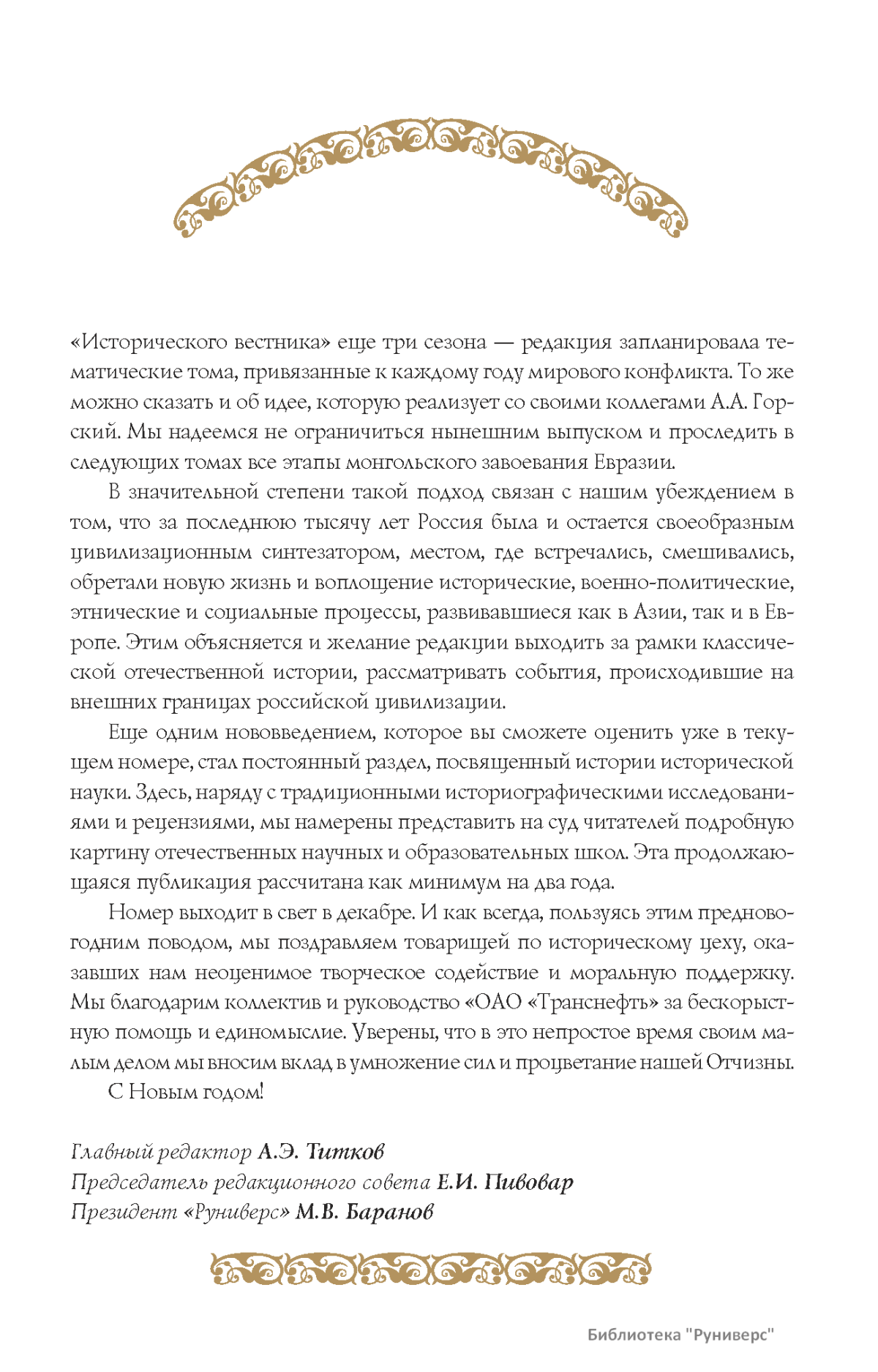 Дорогие коллеги, мы представляем вам первый номер «Исторического вестника», который одновременно обозначается 148-м томом, тем самым продолжая дореволюционное издание. Однако, перешагивая почти сто лет, мы понимаем, что реалии XXI века определяют и новое содержание журнала. История сегодня во многом актуализирована политикой. Именно геополитическая ситуация в мире, возвращающая нас к вопросам сохранения существующих границ, национальных и культурных ценностей, моральных и религиозных принципов, формирует еще одно измерение — проблему аутентичного исторического бытования народов и государств. С одной стороны, это вопрос географических ареалов государственных образований, с другой — тема, связанная с соприкосновением, взаимодействием процессов, культур и традиций. Во многом мы стоим и перед важнейшей этической проблемой. Мы должны не только вежливо и настойчиво указывать нашим уважаемым соседям на свои исторические права, но и сами уходить от искушения искусственного удревнения собственной истории или присвоения чужой. И здесь на сцену выходит его величество Исторический Научный Факт. Он и есть главный цензор и законодатель. На этом незыблемом основании будет строиться редакционная и научная работа «Исторического вестника».