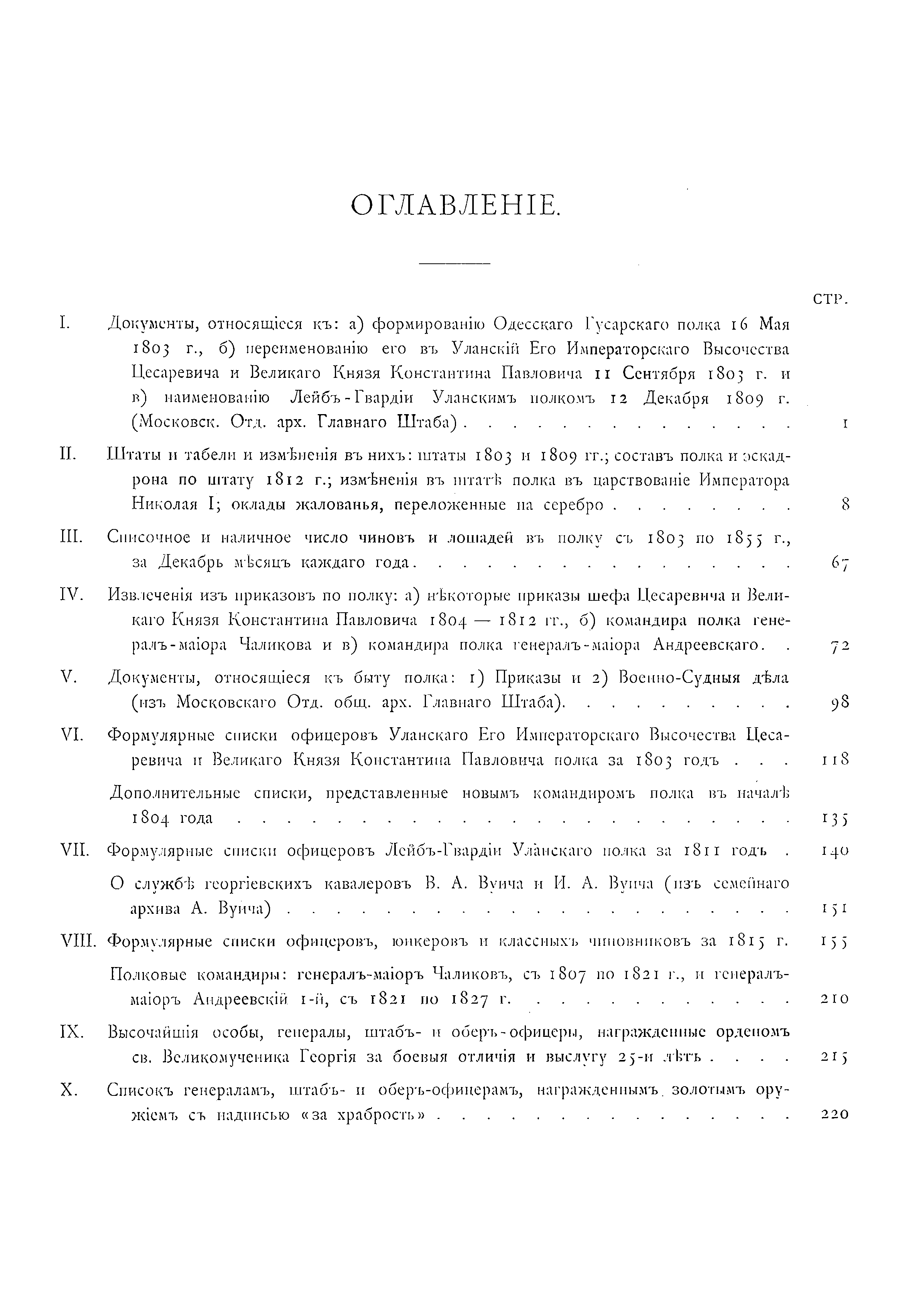 Документальное описание боевых действий полка и знаменательных исторических со-бытий, связанных с ним, за период 1803 – 1825 годов. Приведены описания униформы, вооружения и организации полка, собрание выписок из архивных документов по его истории, списки личного состава полка, кавалеров различных знаков отличия и пр.