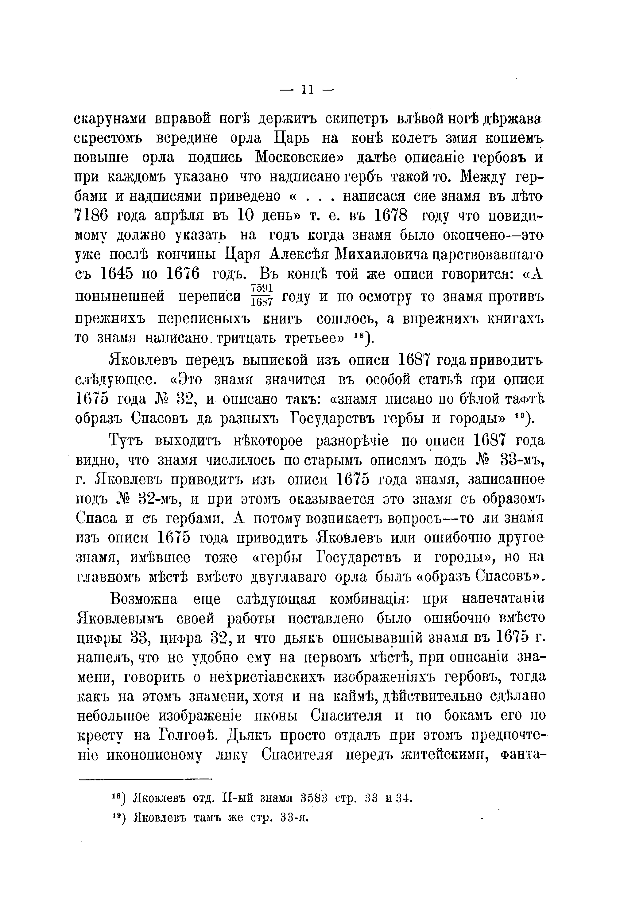 Краткий популярный очерк известного специалиста по военной и военно-морской истории России посвящен описанию знамён, начиная с хоругвей и стягов времён великого князя Дмитрия Донского (в XIV в.) до знамён, принятых в полках Российской императорской армии в эпоху Александра I. В брошюре приведено описание более 320 русских знамён различных периодов российской истории, особое внимание сосредоточено на знамёнах петровского времени. В правление последнего российского императора Николая II в придворных кругах широко обсуждалась проблема национальных цветов. Капитан-лейтенант Белавенец П.И, являясь членом Особого совещания при Министерстве юстиции для выяснения вопроса о русских государственных национальных цветах в 1910-1912 гг., весьма плодотворно занимался геральдикой, историей знамен и флагов. В ходе работы Совещания, и в печати велась острая полемика между сторонниками бело-сине-красного и черно-золото-белого флагов. Сторонниками первого был П.И. Белавенец, доставивший бело-сине-красное знамя Петра Великого, хранившееся в Архангельске и собравший сведения о русских знаменах, захваченных шведами под Нарвой, переиздавший и прокомментировавший книгу К. Алярда о флагах (Амстердам, 1695; Москва, 1709), а затем составивший специальную записку о русских знаменах. Результатом этой деятельности и стало данное издание.