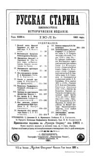 «Русская старина», ежемесячный исторический журнал, выходил в Петербурге в 1870-1918. Основан, издавался и редактировался (1870-1892) М. И. Семевским при участии В. И. Семевского. Последующими редакторами были Н. К. Шильдер (1892-1896), Н. Ф. Дубровин (1896-1904), военные историки С. П. Зыков, П. Н. Воронов.
