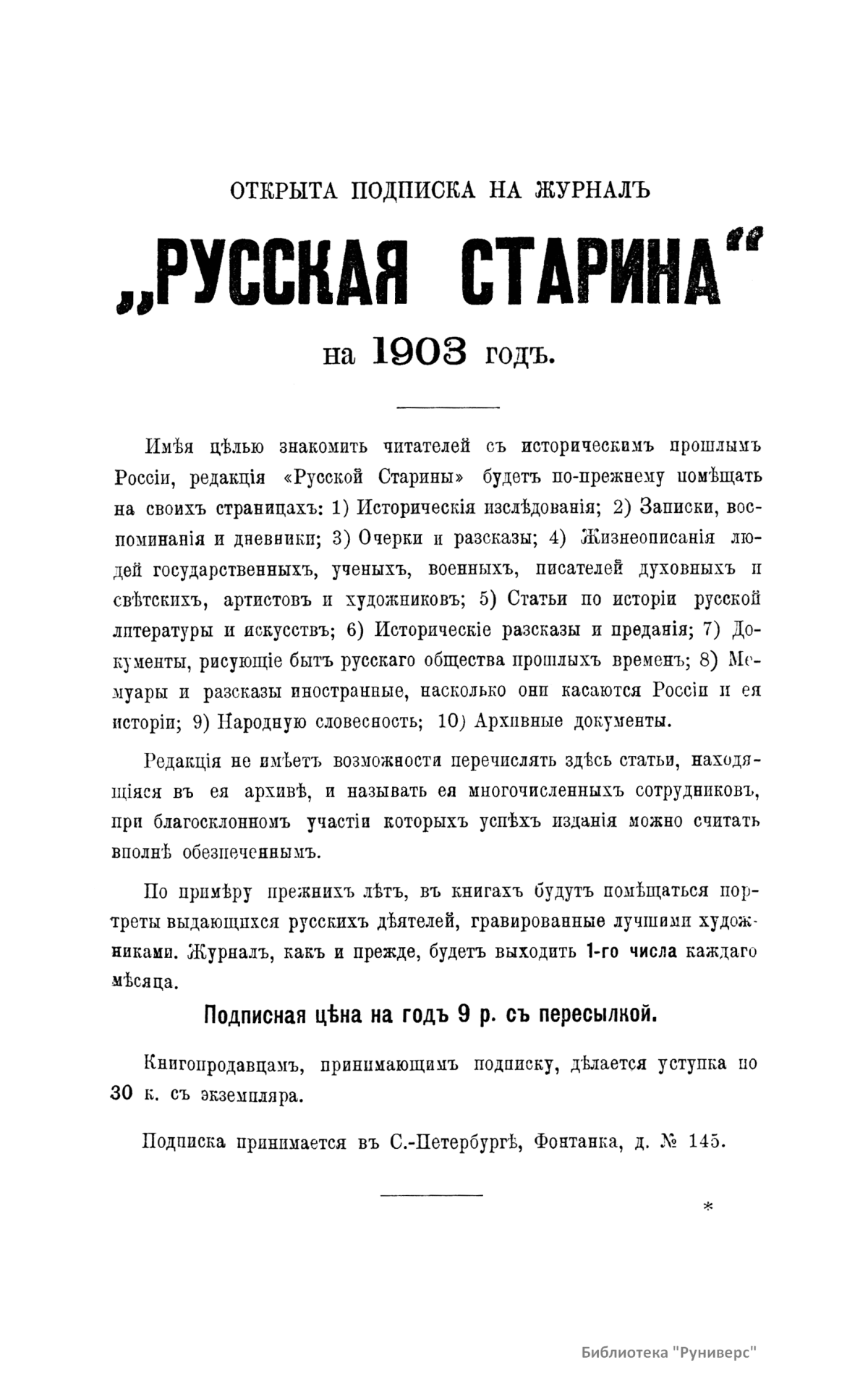 «Русская старина», ежемесячный исторический журнал, выходил в Петербурге в 1870-1918. Основан, издавался и редактировался (1870-1892) М. И. Семевским при участии В. И. Семевского. Последующими редакторами были Н. К. Шильдер (1892-1896), Н. Ф. Дубровин (1896-1904), военные историки С. П. Зыков, П. Н. Воронов.