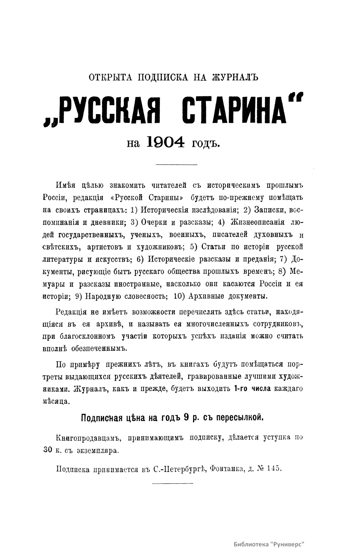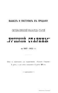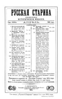 «Русская старина», ежемесячный исторический журнал, выходил в Петербурге в 1870-1918. Основан, издавался и редактировался (1870-1892) М. И. Семевским при участии В. И. Семевского. Последующими редакторами были Н. К. Шильдер (1892-1896), Н. Ф. Дубровин (1896-1904), военные историки С. П. Зыков, П. Н. Воронов.