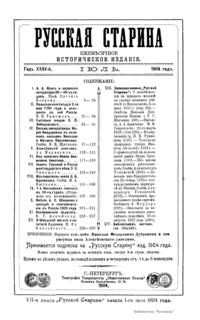 «Русская старина», ежемесячный исторический журнал, выходил в Петербурге в 1870-1918. Основан, издавался и редактировался (1870-1892) М. И. Семевским при участии В. И. Семевского. Последующими редакторами были Н. К. Шильдер (1892-1896), Н. Ф. Дубровин (1896-1904), военные историки С. П. Зыков, П. Н. Воронов.