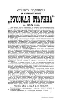 «Русская старина», ежемесячный исторический журнал, выходил в Петербурге в 1870-1918. Основан, издавался и редактировался (1870-1892) М. И. Семевским при участии В. И. Семевского. Последующими редакторами были Н. К. Шильдер (1892-1896), Н. Ф. Дубровин (1896-1904), военные историки С. П. Зыков, П. Н. Воронов.