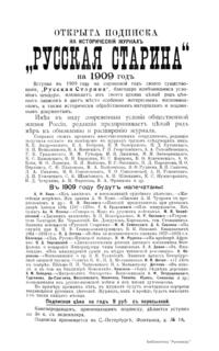 «Русская старина», ежемесячный исторический журнал, выходил в Петербурге в 1870-1918. Основан, издавался и редактировался (1870-1892) М. И. Семевским при участии В. И. Семевского. Последующими редакторами были Н. К. Шильдер (1892-1896), Н. Ф. Дубровин (1896-1904), военные историки С. П. Зыков, П. Н. Воронов.