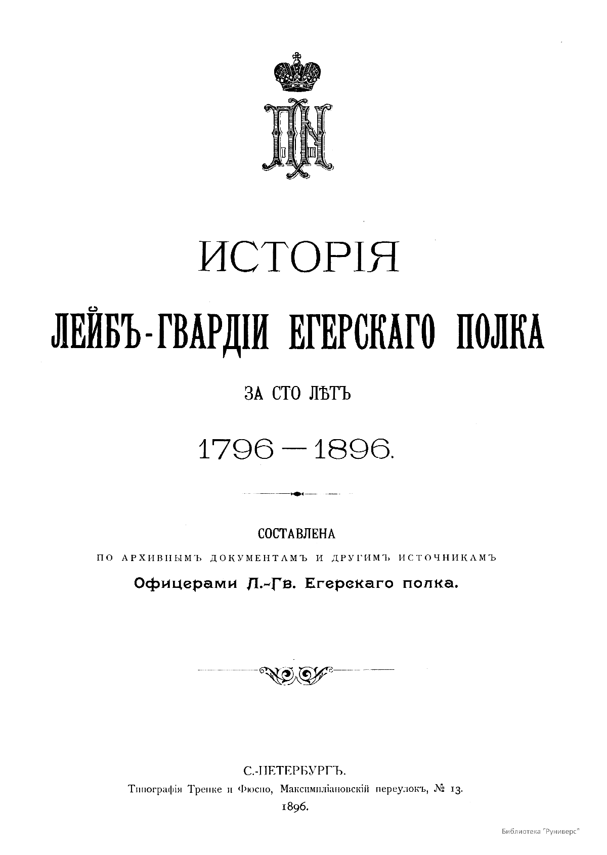 В 1896 г. вышло в свет двухтомное юбилейное издание «История лейб-гвардии Егерского полка за сто лет: 1796–1896», составленное офицерами полка на основании архивных документов, статей из периодических изданий и мемуаров.