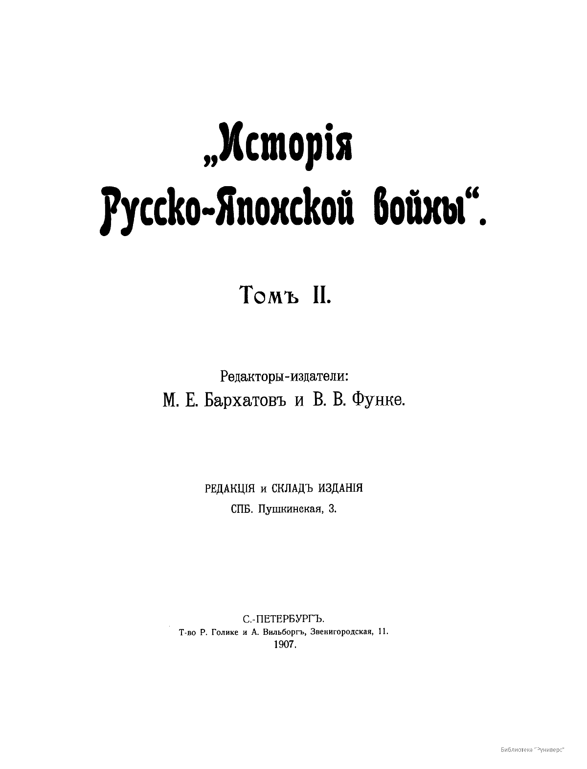 Издание «История Русско-японской войны» было подготовлено М. Е. Бархатовым и В. В. Функе вскоре после окончания Русско-японской войны. На иллюстрированном титульном листе первого тома название — «Полная художественно-иллюстрированная боевыми, бытовыми и разными военными снимками «История Русско-Японской войны» с изящно выполненными картами, планами и кроки в 5-ти томах и 6-й том: художественный альбом портретов участников войны». Портсмутский договор изменил политическое равновесие в мире. В иностранной прессе проскальзывали высказывания об «упадке веры в русское всемогущество». Поддержание дипломатического статуса России между европейскими державами было наиглавнейшей задачей правительства. Для сбора полной достоверной информации при Главном управлении Генерального штаба была создана военно-историческая комиссия по описанию Русско-японской войны. Один из членов комиссии участник войны, генерал-лейтенант М. В. Грулёв внес значительный вклад в составление многотомника. Книга опиралась на широкий круг источников, как опубликованных, так и находившихся в рукописях или существовавших в устной форме. Здесь были представлены официальные документы, воспоминания участников, как русских военных, так и европейских офицеров и журналистов, следивших за ходом военных действий. В «Истории» впервые появилась систематизация данных о войне. Цифры потерь, сообщения очевидцев, судьбы участников — все это явилось новым этапом в развитии историографии русско-японской кампании 1904–1905 гг. Издание включает большое количество фотоснимков, карт, планов. В шестом томе художественно выполнены портреты участников войны: от генералов, командующих армией, до медсестер и полевых священников, с краткими биографическими сведениями.