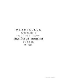 Научные труды П.С. Палласа выходили сначала на родном ему, немецком языке, а потом переводились на русский. Перевод с немецкого труда «Путешествие по разным местам Российского государства» в трех частях (пяти книгах) был выполнен Ф. Туманским и учеником Палласа, Василием Зуевым, состоявшим в его экспедиционном отряде. Впервые на русском языке «Путешествие…» было издано в 1773–1788 гг. в серии «Собрания, старающегося о переводе иностранных книг», учрежденной Екатериной II.