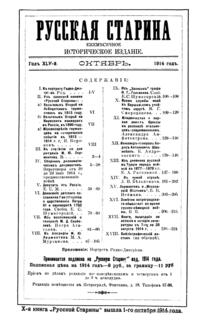 «Русская старина», ежемесячный исторический журнал, выходил в Петербурге в 1870-1918. Основан, издавался и редактировался (1870-1892) М. И. Семевским при участии В. И. Семевского. Последующими редакторами были Н. К. Шильдер (1892-1896), Н. Ф. Дубровин (1896-1904), военные историки С. П. Зыков, П. Н. Воронов.