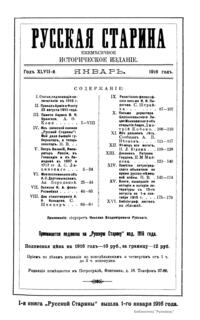 «Русская старина», ежемесячный исторический журнал, выходил в Петербурге в 1870-1918. Основан, издавался и редактировался (1870-1892) М. И. Семевским при участии В. И. Семевского. Последующими редакторами были Н. К. Шильдер (1892-1896), Н. Ф. Дубровин (1896-1904), военные историки С. П. Зыков, П. Н. Воронов.