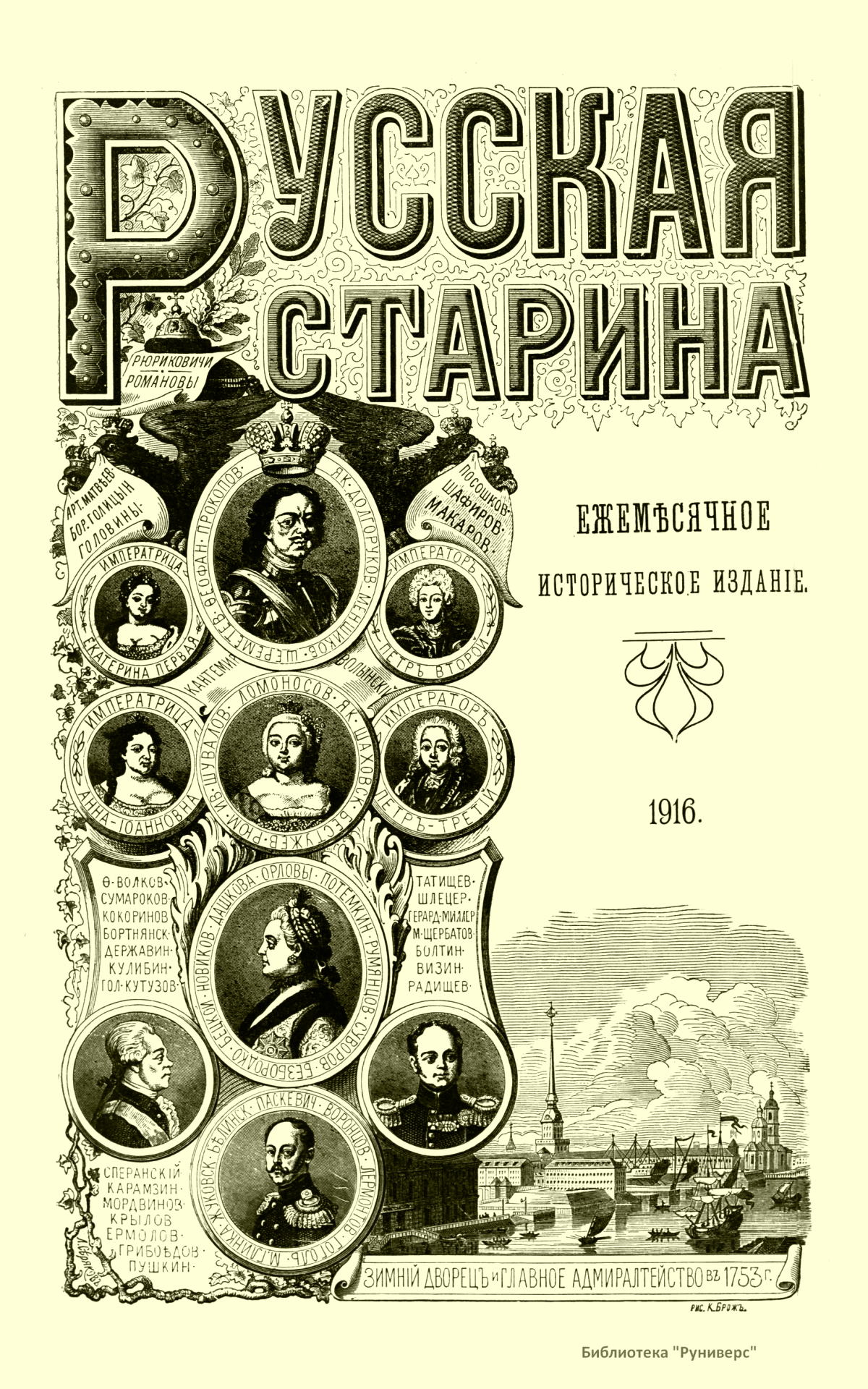 «Русская старина», ежемесячный исторический журнал, выходил в Петербурге в 1870-1918. Основан, издавался и редактировался (1870-1892) М. И. Семевским при участии В. И. Семевского. Последующими редакторами были Н. К. Шильдер (1892-1896), Н. Ф. Дубровин (1896-1904), военные историки С. П. Зыков, П. Н. Воронов.