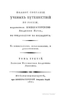 «Полное собрание ученых путешествий по России» вышло в свет по инициативе президента Санкт-Петербургской академии наук С. С. Уварова с целью обобщения и распространения основных сведений о России, полученных в результате экспедиций Академии наук, предпринятых в разные годы. В сочинение вошли следующие исследования: «Описание земли Камчатки» Степана Петровича Крашенинникова, ботаника и этнографа, участника Второй Камчатской экспедиции; «Записки путешествия академика Лепехина» (Иван Иванович Лепехин, естествоиспытатель и лексикограф, принимал участие во многих научных экспедициях по Уралу, Поволжью, Западной Сибири и Русскому Северу); «Записки путешествия академика Фалька» (Иоганн Петер Фальк, врач и естествоиспытатель, был начальником Оренбургской экспедиции, охватившей Сибирь и Алтай). Каждое исследование предваряет биография автора.