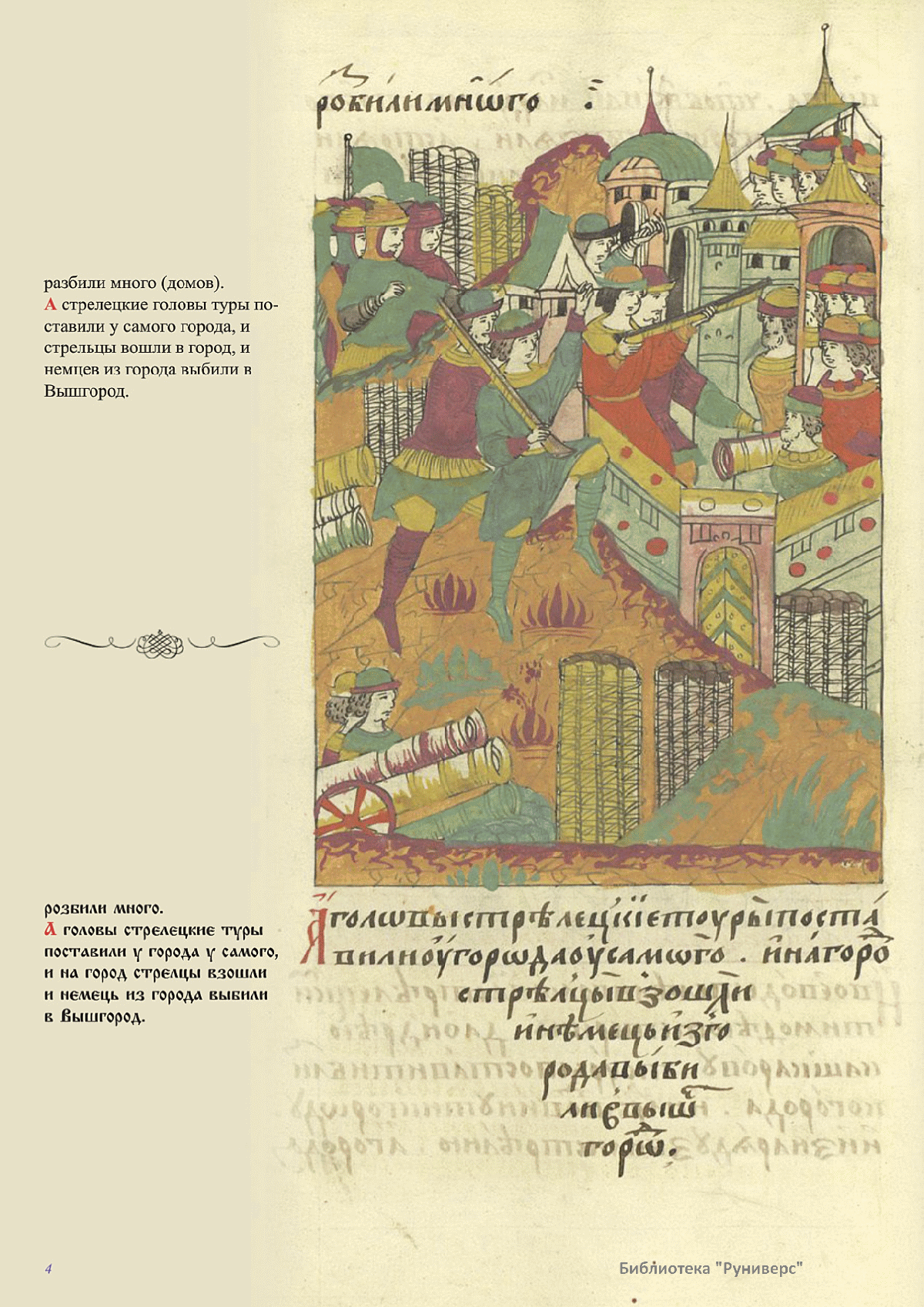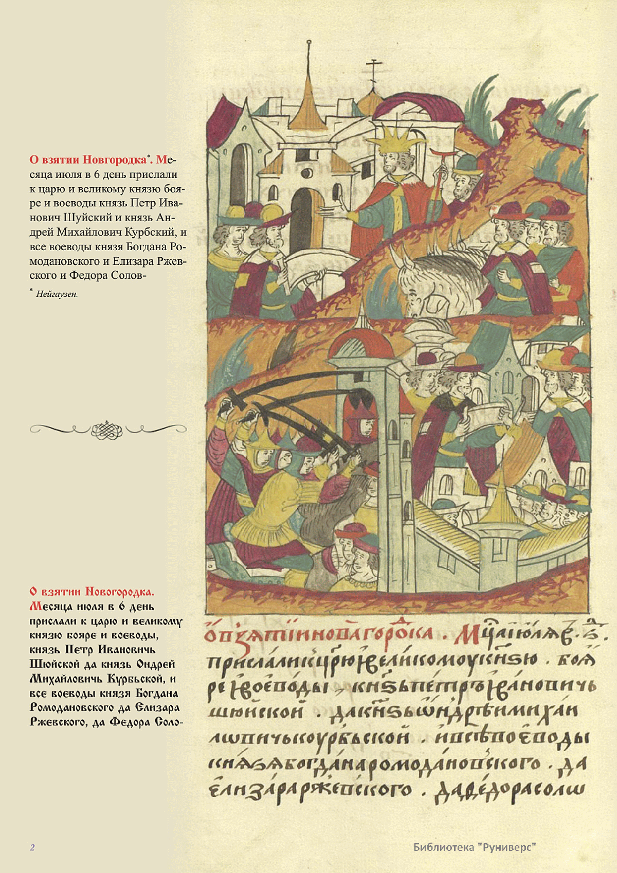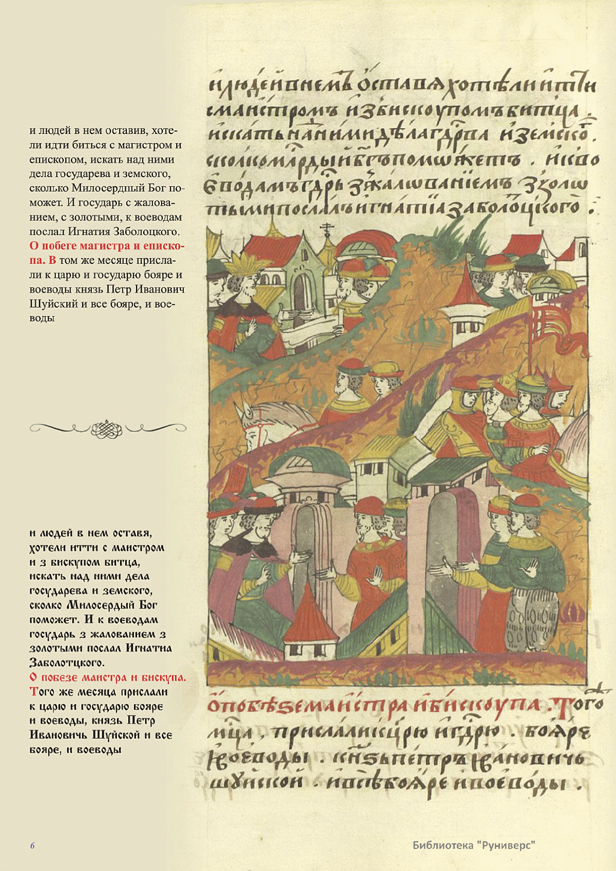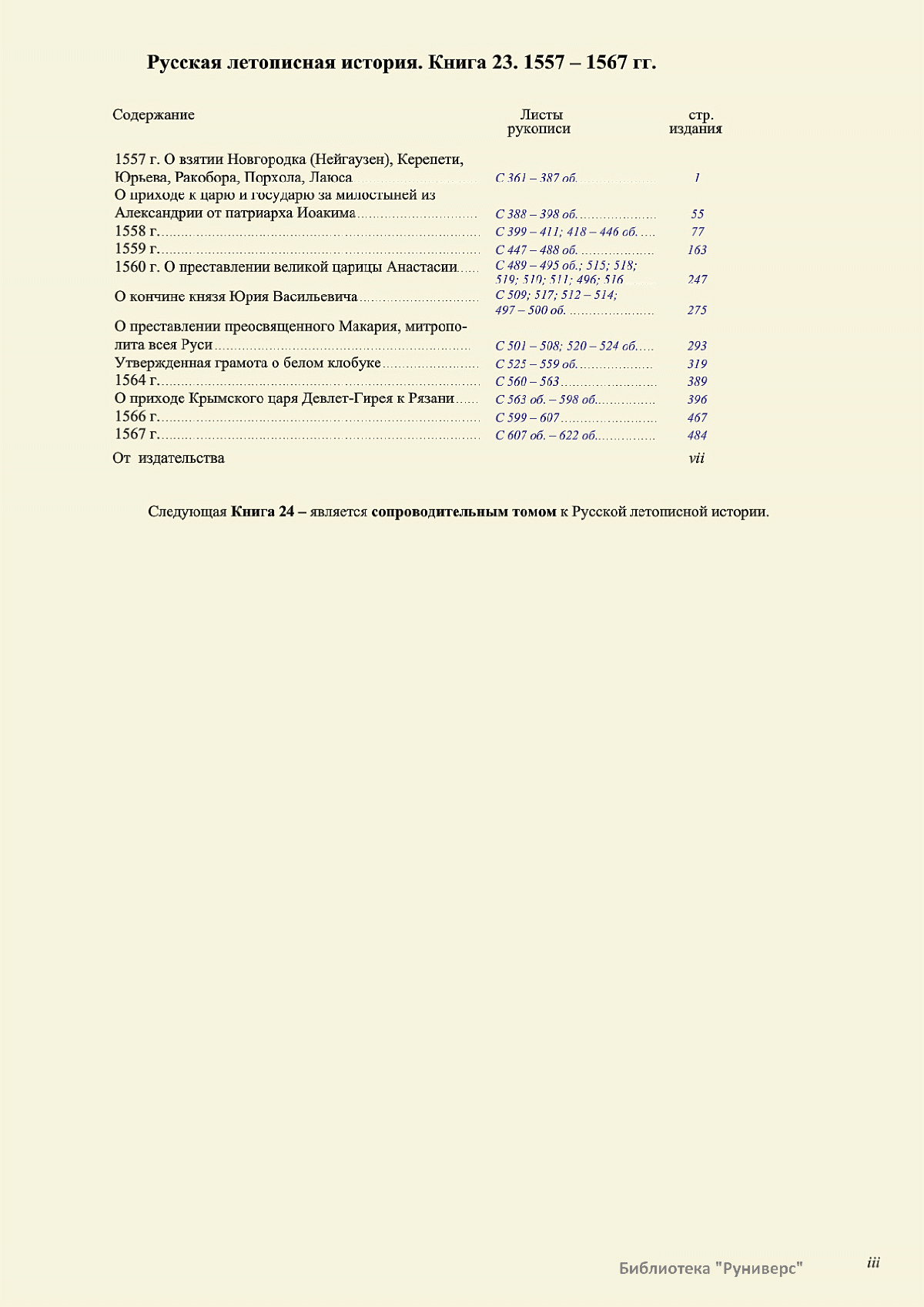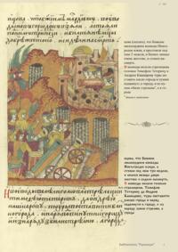Лицевой летописный свод. XVI века — монументальный памятник древнерусского книжного искусства. На 10 тысячах листов с более чем 17 тысячами красочных миниатюр — «окон в историю» — представлена самая ранняя историческая и литературная энциклопедия. Лицевой свод дошел до наших дней в 10 томах, находящихся в разных древлехранилищах: БАН к РНБ в Санкт-Петербурге и ГИМ в Москве. Фирма «АКТЕОН» совместно с хранителями впервые осуществила научное факсимильное издание «Лицевой летописный свод XVI века». Предлагаемое издание с переводом — как дополнение в рамках научного аппарата вышеназванного факсимиле - представлено тремя разделами: библейская история, всемирная история, русская летописная история. В настоящем издании листы расположены в хронологическом порядке повествования На внешнем поле размещены транслитерация и перевод на современный русский язык. Русская летописная история 1114—1567 гг. — отражена на 6010 Лицевого летописного свода XVI века в следующих его томах: Г — Голицынский том (Отдел рукописей Российский национальной библиотеки, F.IV.225), Л — Лаптевский TOM (Отдел рукописей Российской национальной библиотеки, F.IV.233), O-I — Остермановский первый том (Отдел рукописей Библиотеки Академии наук, 31. 7. 30-1), O-II — Остермановский второй той (Отдел рукописей Библиотеки Академии наук, 31, 7. 30-2), Ш — Шумиловский том (Отдел рукописей Российской национальной библиотеки, F, IY. 232), С — Синодальный том (Отдел рукописей Государственного Исторического музея. Син. № 962), Ц— Царственная книга (Отдел рукописей Государственного Историческою музея. Син. № 149). В сносках отряжены разночтения с перепей ПСРЛ — Полным собранием русских летописей - фундаментальной для изучения истории древней и средневековой Руси книжной серией (её тексты, в основном, издавались наборно, в орфографии XIX века).
