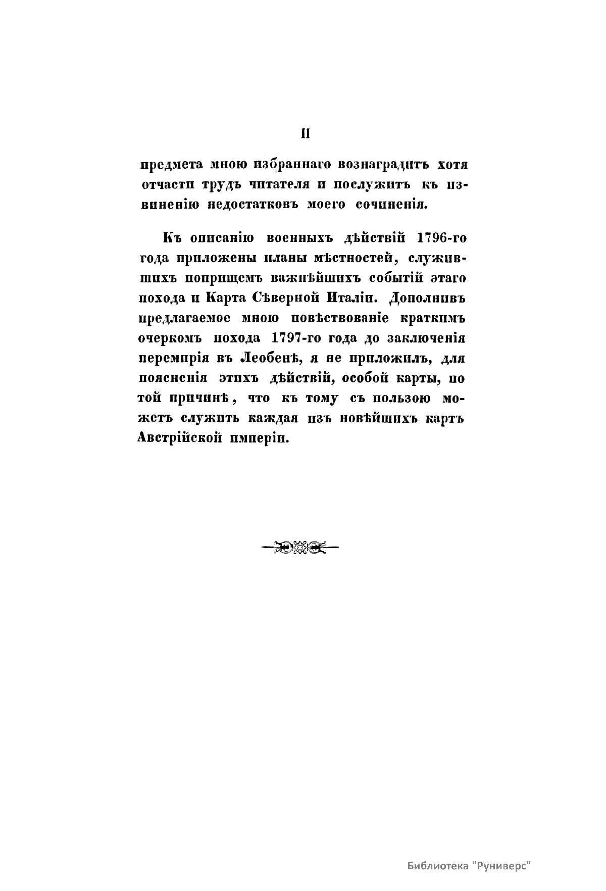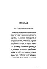 Подвиги великого полководца Бонапарта были увековечены в книгах и полотнах, его воззвания общепризнанны за образцы высокого военного красноречия. «Поход 1796 года Бонапарта в Италии» — первое сочинение подполковника, профессора Императорской военной академии М. И. Богдановича. Книга выпущена в 1845 г. в Санкт-Петербурге. Труд представляет собой критический обзор боевых действий в Италии во время войны 1796–1797 гг. Франции с первой коалицией европейских держав (Австрия, Великобритания, Россия, Сардиния, Королевство обеих Сицилий и др.). Он составлен на основе произведений известнейших военных писателей Г. В. Жомини, К. Клаузевица, мемуаров Наполеона и др. Здесь рассмотрена талантливая стратегия и тактика генерала Наполеона Бонапарта, под командованием которого французские войска выигрывали сражения с превосходящими силами австро-сардинских войск. К историческому описанию военных действий приложены пять карт и планов местностей, напечатанные на одном складном листе, и отдельно — «Карта Северной Италии». Повествование дополнено кратким очерком похода 1797 г. до заключения перемирия в Леобене.