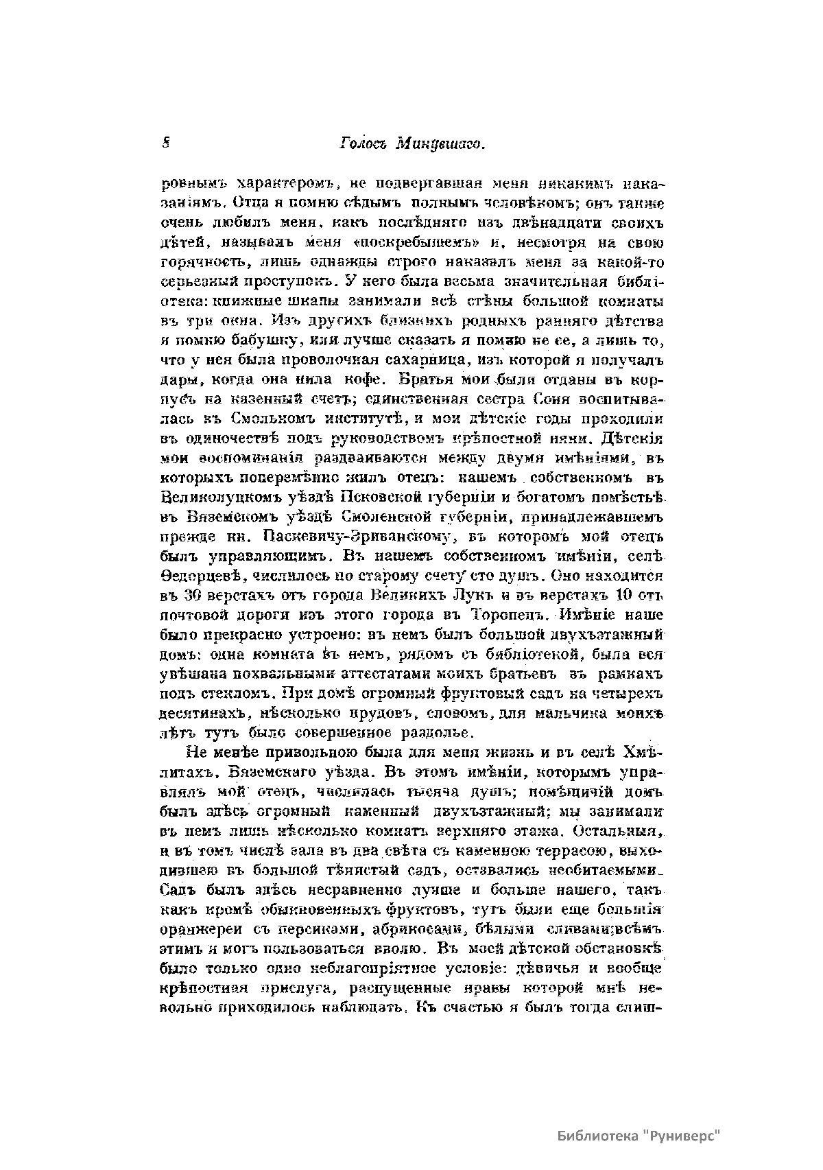 «Голос Минувшего» — журнал истории и истории литературы либерально-народнического направления, издававшийся в Москве с 1913 по 1923 год. Издателем журнала в 1913–1922 годах были известные русские историки, публицисты и общественные деятели С. П. Мельгунов (1880–1956) и В. И. Семевский (1848–1916). В редакционную коллегию также входили А. К. Дживелегов и П. Н. Сакулин. До 1919 «Голос минувшего» выходил ежемесячно, затем нерегулярно, всего было выпущено 65 номеров. В журнале публиковались интереснейшие материалы, посвященные истории литературы и общественных движений в России второй половины XVIII – начала XX веков. Здесь можно найти: статьи по вопросам русской и всеобщей истории, истории литературы, философии, искусства и археологии. В издании представлены: историческая беллетристика, биографии русских и иностранных деятелей, критика и библиография, новости русской и иностранной науки, обзор журналов русских и иностранных, хроника, мемуары, записки, дневники и письма декабристов, видных народовольцев и эсеров, крупных общественных деятелей и царских администраторов, писателей, военачальников и др. Среди авторов: Е. В. Тарле, А. Ф. Кони, А. К. Дживелегов, А. А. Кизеветтер, В. Г. Короленко и др. Стремление сделать журнал интересным для более широкого круга читателей способствовало тому, что в «Голосе Минувшего», хоть и в ограниченном количестве, печатались статьи по истории искусства и помещались иллюстрации: портреты, картины и рисунки, не знакомые или мало знакомые публике. В журнале опубликован целый ряд интересных писем, документов и воспоминаний. Абсолютное большинство текстов никогда не переиздавалось. Журнал снабжен указателями имен за 1913–1922 годы и систематическим указателем содержания.