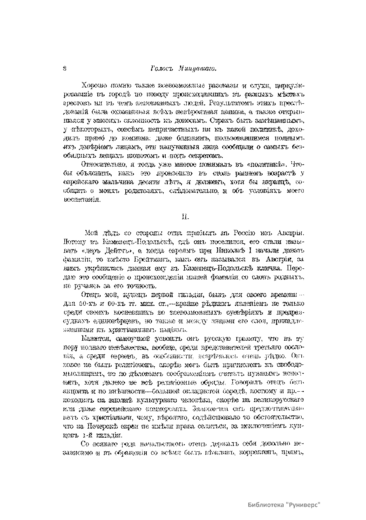 «Голос Минувшего» — журнал истории и истории литературы либерально-народнического направления, издававшийся в Москве с 1913 по 1923 год. Издателем журнала в 1913–1922 годах были известные русские историки, публицисты и общественные деятели С. П. Мельгунов (1880–1956) и В. И. Семевский (1848–1916). В редакционную коллегию также входили А. К. Дживелегов и П. Н. Сакулин. До 1919 «Голос минувшего» выходил ежемесячно, затем нерегулярно, всего было выпущено 65 номеров. В журнале публиковались интереснейшие материалы, посвященные истории литературы и общественных движений в России второй половины XVIII – начала XX веков. Здесь можно найти: статьи по вопросам русской и всеобщей истории, истории литературы, философии, искусства и археологии. В издании представлены: историческая беллетристика, биографии русских и иностранных деятелей, критика и библиография, новости русской и иностранной науки, обзор журналов русских и иностранных, хроника, мемуары, записки, дневники и письма декабристов, видных народовольцев и эсеров, крупных общественных деятелей и царских администраторов, писателей, военачальников и др. Среди авторов: Е. В. Тарле, А. Ф. Кони, А. К. Дживелегов, А. А. Кизеветтер, В. Г. Короленко и др. Стремление сделать журнал интересным для более широкого круга читателей способствовало тому, что в «Голосе Минувшего», хоть и в ограниченном количестве, печатались статьи по истории искусства и помещались иллюстрации: портреты, картины и рисунки, не знакомые или мало знакомые публике. В журнале опубликован целый ряд интересных писем, документов и воспоминаний. Абсолютное большинство текстов никогда не переиздавалось. Журнал снабжен указателями имен за 1913–1922 годы и систематическим указателем содержания.