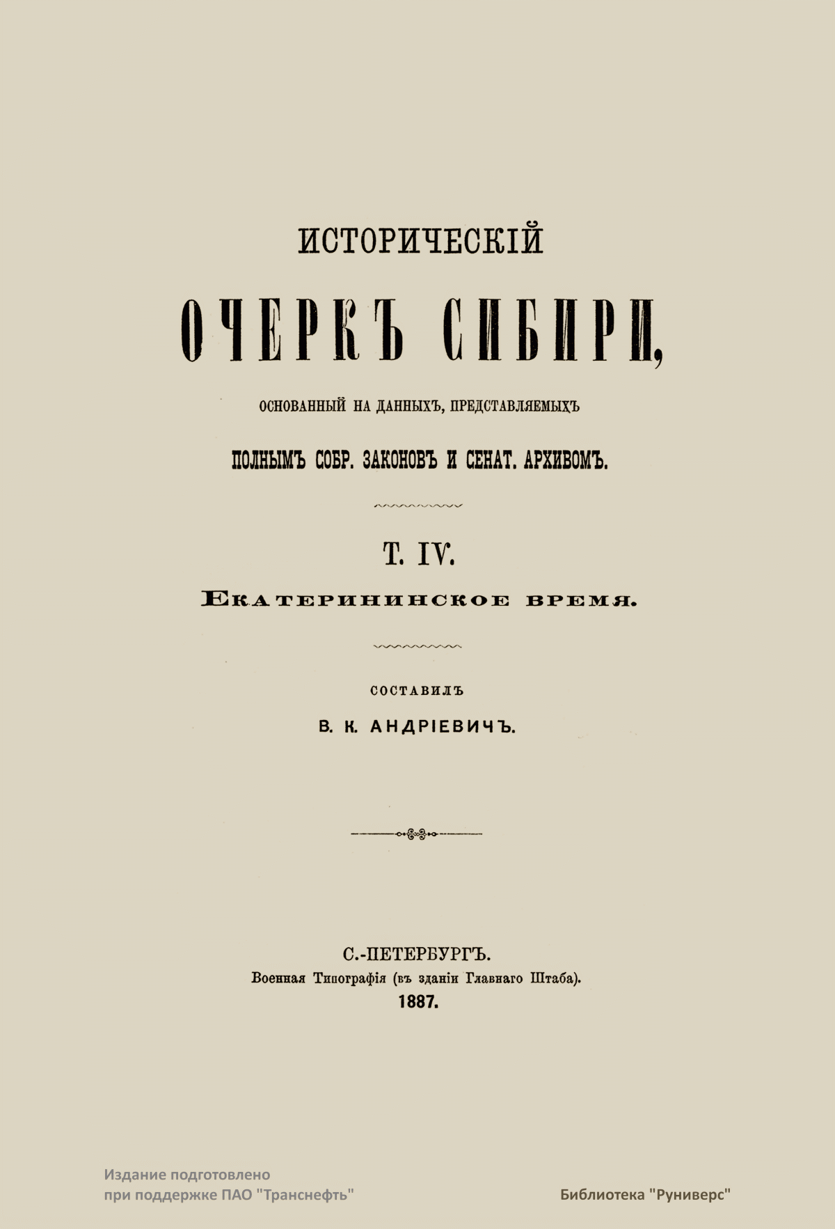 Историческiй очеркъ Сибири по даннымъ, представляемымъ Полнымъ собранiемъ законовъ. Т. IV. Екатерининское время