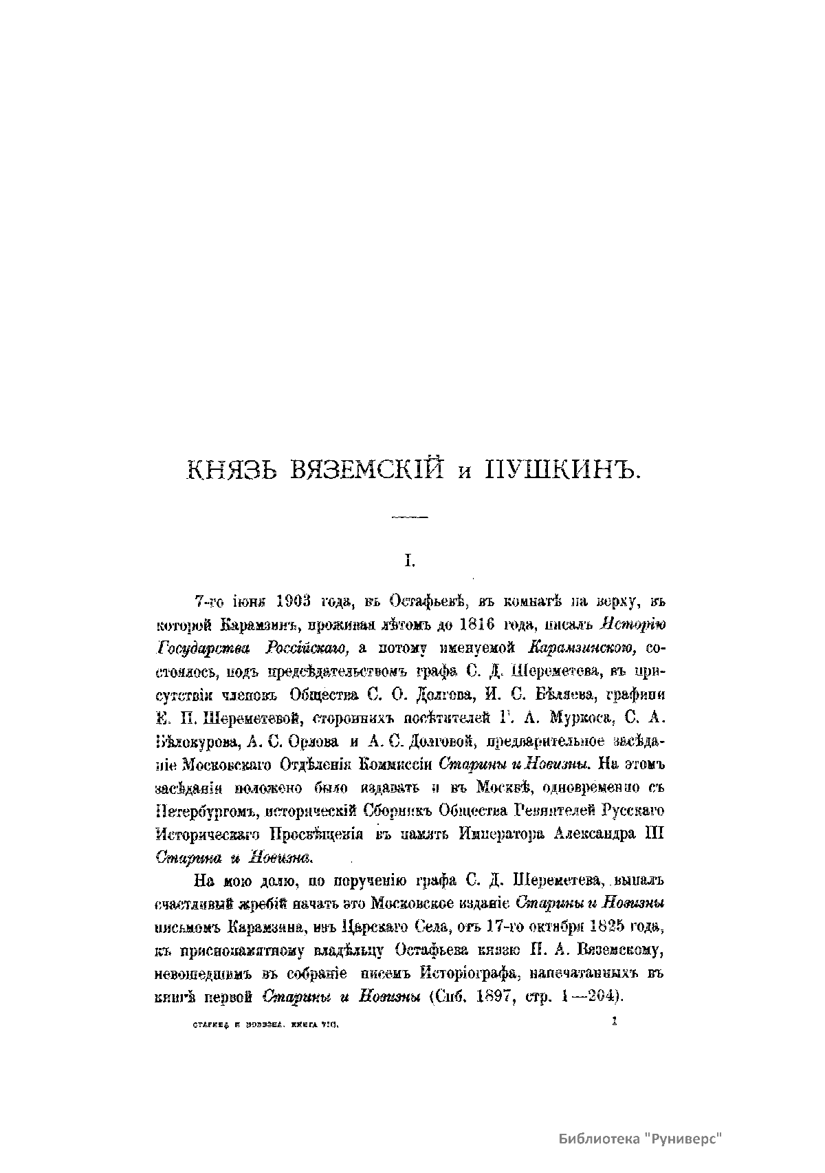 «Старина и новизна» — русский исторический сборник, издававшийся «Обществом ревнителей русского исторического просвещения в память императора Александра III». Сборник выходил в Петербурге в 1897–1904 и в Москве в 1904–1917 годах по мере накопления материала. Руководил изданием сборника граф С. Д. Шереметев (1844–1918) — историк, археолог, председатель «Общества», одного из первых объединений историков монархического направления. Члены общества способствовали изданию документов прошлого, содействуя развитию исторической науки и популяризации интереса к историческим материалам. «Старина и новизна» представляет собой собрание документальных материалов по русской истории и литературе XVII–XIX века. Вместе с Шереметевым в создании сборника участвовали блестящие историки А. П. и Н. П. Барсуковы, С. Ф. Платонов, Л. П. Майков и др.