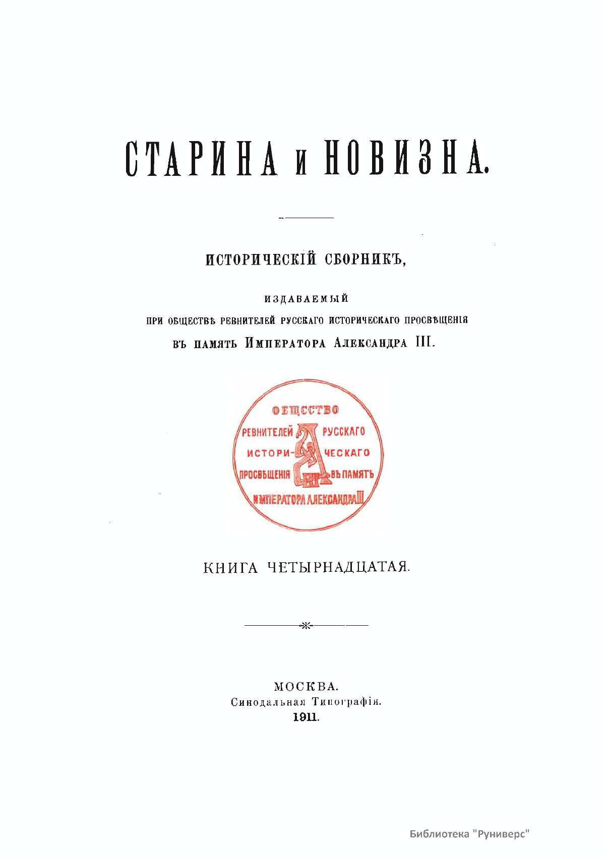 «Старина и новизна» — русский исторический сборник, издававшийся «Обществом ревнителей русского исторического просвещения в память императора Александра III». Сборник выходил в Петербурге в 1897–1904 и в Москве в 1904–1917 годах по мере накопления материала. Руководил изданием сборника граф С. Д. Шереметев (1844–1918) — историк, археолог, председатель «Общества», одного из первых объединений историков монархического направления. Члены общества способствовали изданию документов прошлого, содействуя развитию исторической науки и популяризации интереса к историческим материалам. «Старина и новизна» представляет собой собрание документальных материалов по русской истории и литературе XVII–XIX века. Вместе с Шереметевым в создании сборника участвовали блестящие историки А. П. и Н. П. Барсуковы, С. Ф. Платонов, Л. П. Майков и др.