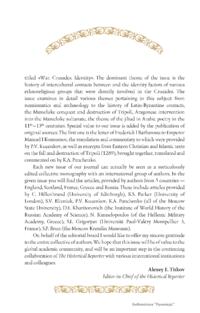 Дорогие коллеги, мы представляем вам первый номер «Исторического вестника», который одновременно обозначается 148-м томом, тем самым продолжая дореволюционное издание. Однако, перешагивая почти сто лет, мы понимаем, что реалии XXI века определяют и новое содержание журнала. История сегодня во многом актуализирована политикой. Именно геополитическая ситуация в мире, возвращающая нас к вопросам сохранения существующих границ, национальных и культурных ценностей, моральных и религиозных принципов, формирует еще одно измерение — проблему аутентичного исторического бытования народов и государств. С одной стороны, это вопрос географических ареалов государственных образований, с другой — тема, связанная с соприкосновением, взаимодействием процессов, культур и традиций. Во многом мы стоим и перед важнейшей этической проблемой. Мы должны не только вежливо и настойчиво указывать нашим уважаемым соседям на свои исторические права, но и сами уходить от искушения искусственного удревнения собственной истории или присвоения чужой. И здесь на сцену выходит его величество Исторический Научный Факт. Он и есть главный цензор и законодатель. На этом незыблемом основании будет строиться редакционная и научная работа «Исторического вестника».