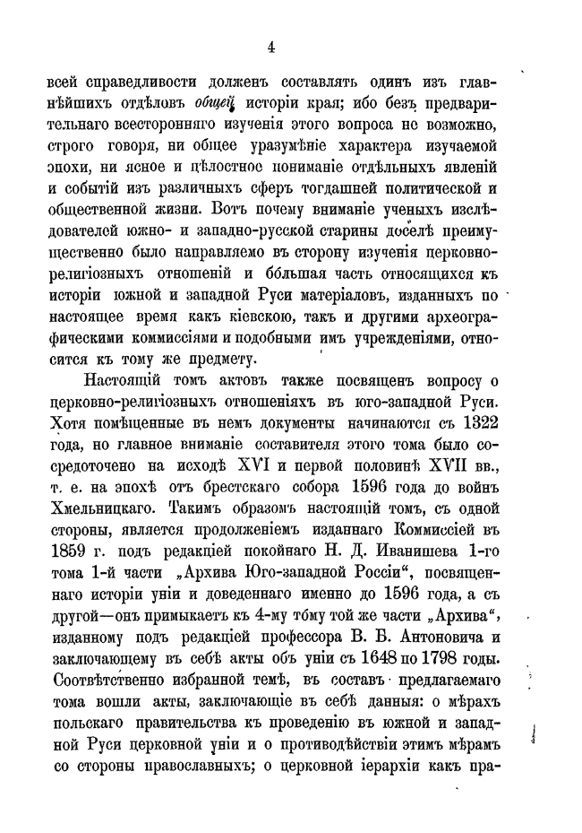Киевский архив был учрежден по высочайшему повелению в 1852 г., при университете св. Владимира, для хранения древних актовых книг губерний Киевской, Подольской и Волынской. Учреждение его состоялось по инициативе главного деятеля временной комиссии, открытой в 1843 для разбора древних актов при киевском военном, подольском и волынском генерал-губернаторе, — профессора Н. Д. Иванишева. Описание этого архива пошло успешно под руководством г. Царевского (с 1866): четыре описи актовых книг напечатаны в 1869. Всего книг в архиве 5883, ежегодно описывалось до 5 книг. Издание исторических материалов этого архива предприняла Киевская археографическая комиссия, издававшая с 1859 по 1911 года «Архив Юго-Западной России».