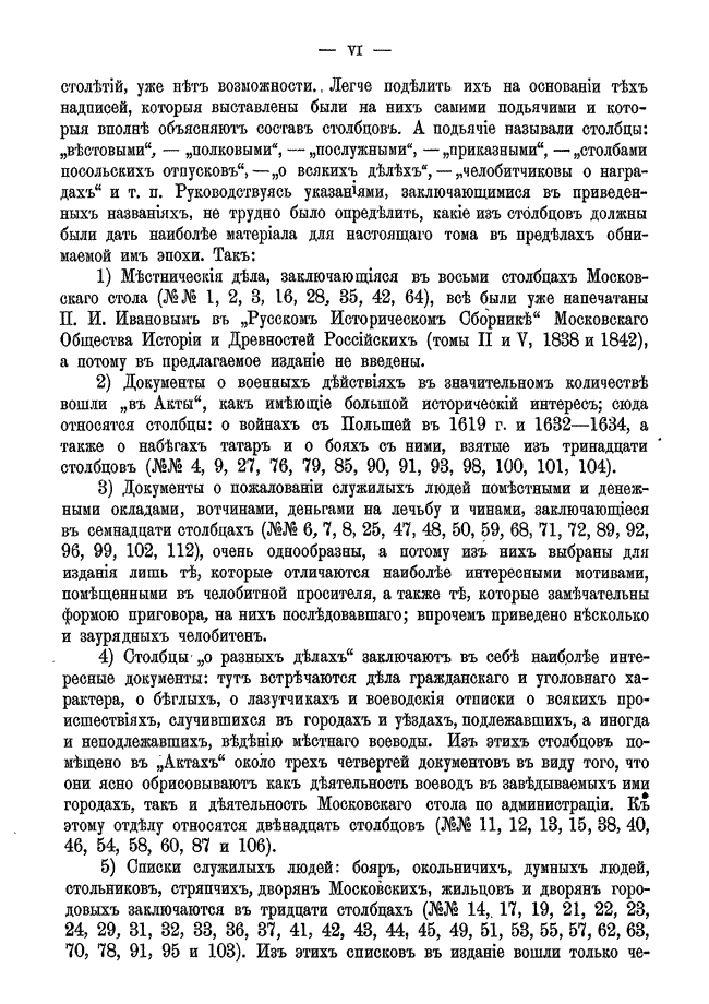 Комитет, приводивший в порядок Московские Сенатские архивы после разорения их французами в 1812 году, отнес к Московскому столу Разрядного приказа, ведавшего всеми распорядками государственной службы, 208 книг и 1180 столбцов. Книги по их содержанию были разделены на разрядные, записные, боярские, жилецкие, списки рейтарских, драгунских и солдатских полков, десятни. Редакция отбирает наиболее важные и никогда ранее не публиковавшиеся дела с 1571-го по 1664 год.