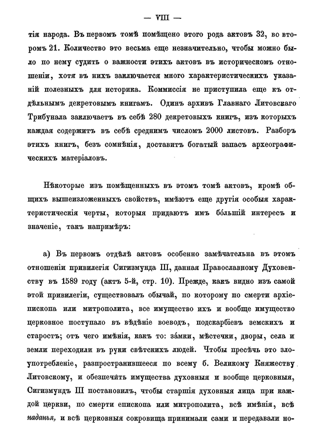 Обилие актов и документов Виленского центрального архива (19244 актовых книг) и желание исследовать прошлое Литвы, которая и в старину принадлежала России, вызвали после 1863 года учреждение особой комиссии для разбора в городе Вильне древних актов.