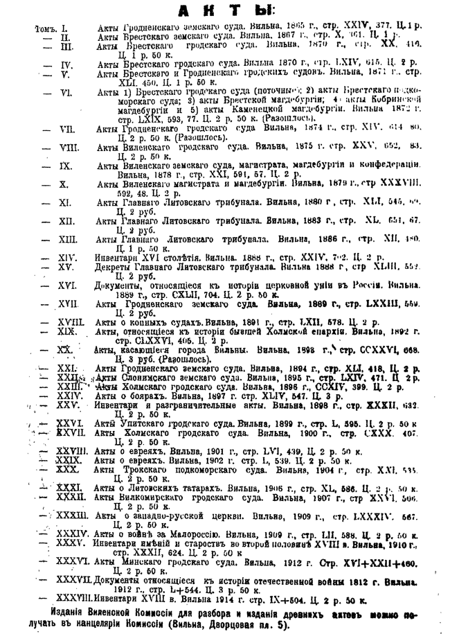 Обилие актов и документов Виленского центрального архива (19244 актовых книг) и желание исследовать прошлое Литвы, которая и в старину принадлежала России, вызвали после 1863 года учреждение особой комиссии для разбора в городе Вильне древних актов.
