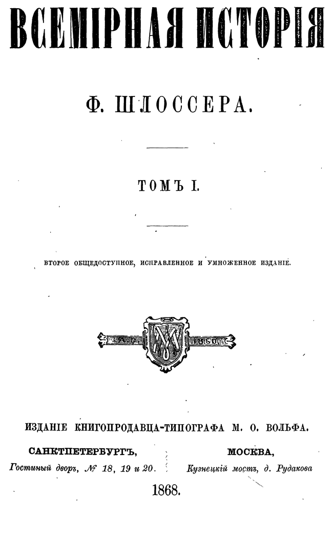 «Всемирная история» — знаменитый фундаментальный труд немецкого ученого Фридриха Кристофа Шлоссера представляет собой синтез его специальных исследований и университетских курсов. Описываемый период доведен до 1815 года.