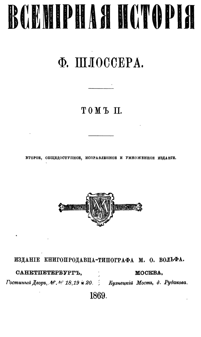 «Всемирная история» — знаменитый фундаментальный труд немецкого ученого Фридриха Кристофа Шлоссера представляет собой синтез его специальных исследований и университетских курсов. Описываемый период доведен до 1815 года.