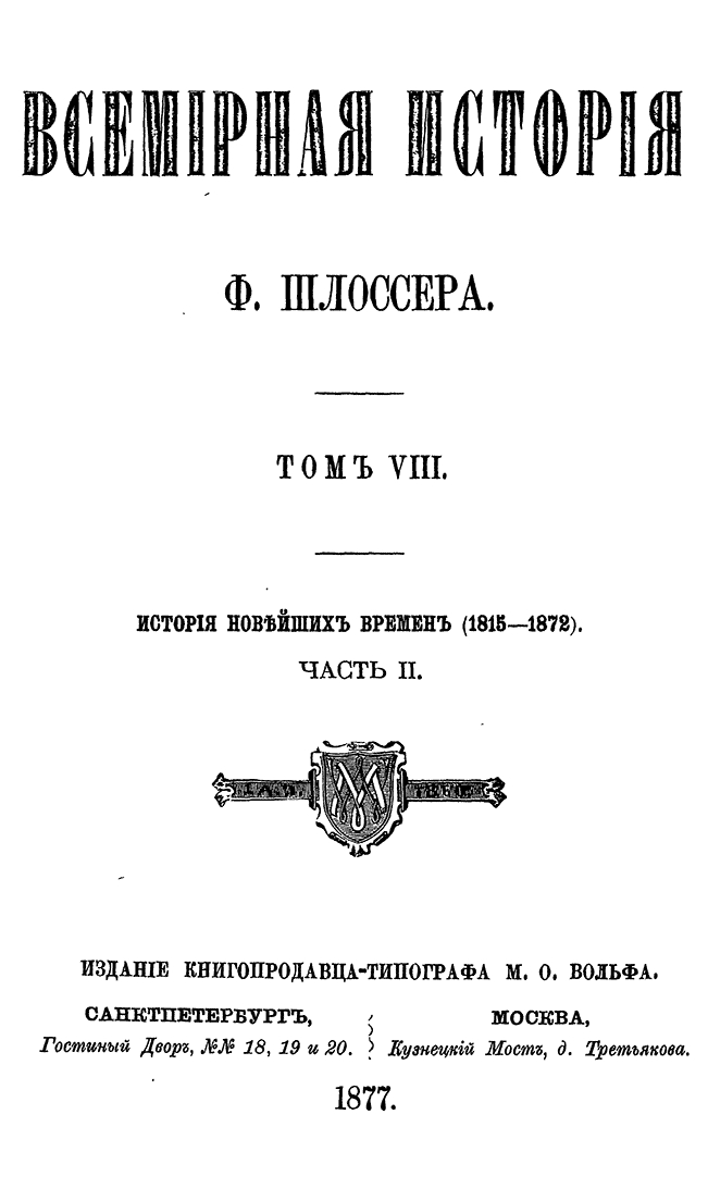 «Всемирная история» — знаменитый фундаментальный труд немецкого ученого Фридриха Кристофа Шлоссера представляет собой синтез его специальных исследований и университетских курсов. Описываемый период доведен до 1815 года.