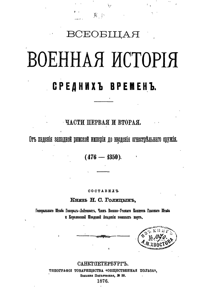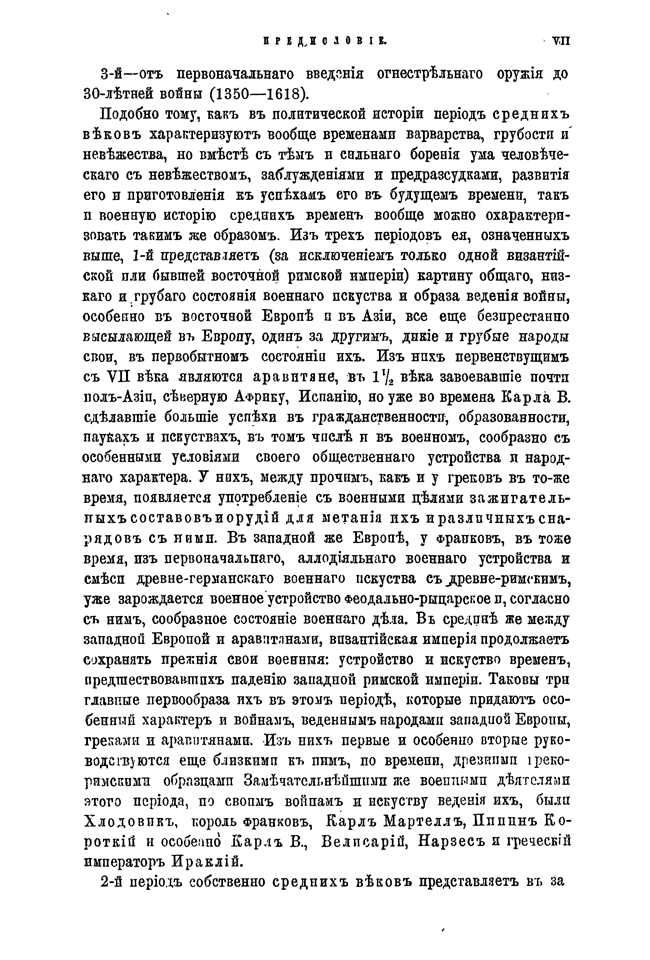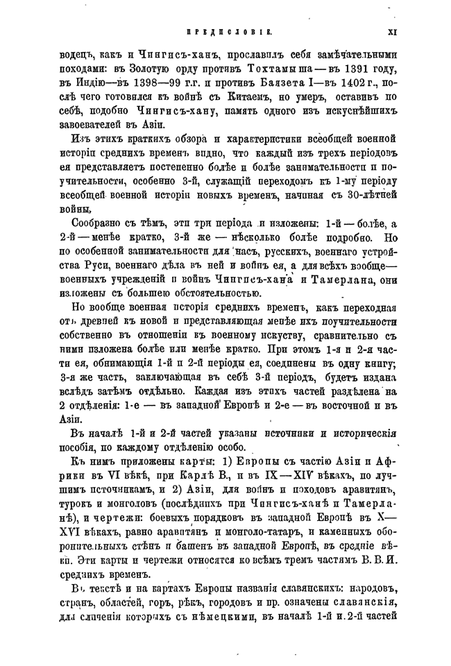 «Всеобщая военная история средних времен» состоит из двух частей. Первая посвящена историческим событиям от падения Западной Римской Империи до смерти Карла Великого, образовавшего обширную империю франков (476-814). Вторая часть рассказывает об истории следующего периода — от смерти Карла Великого до первоначального введения огнестрельного оружия (814-1350).