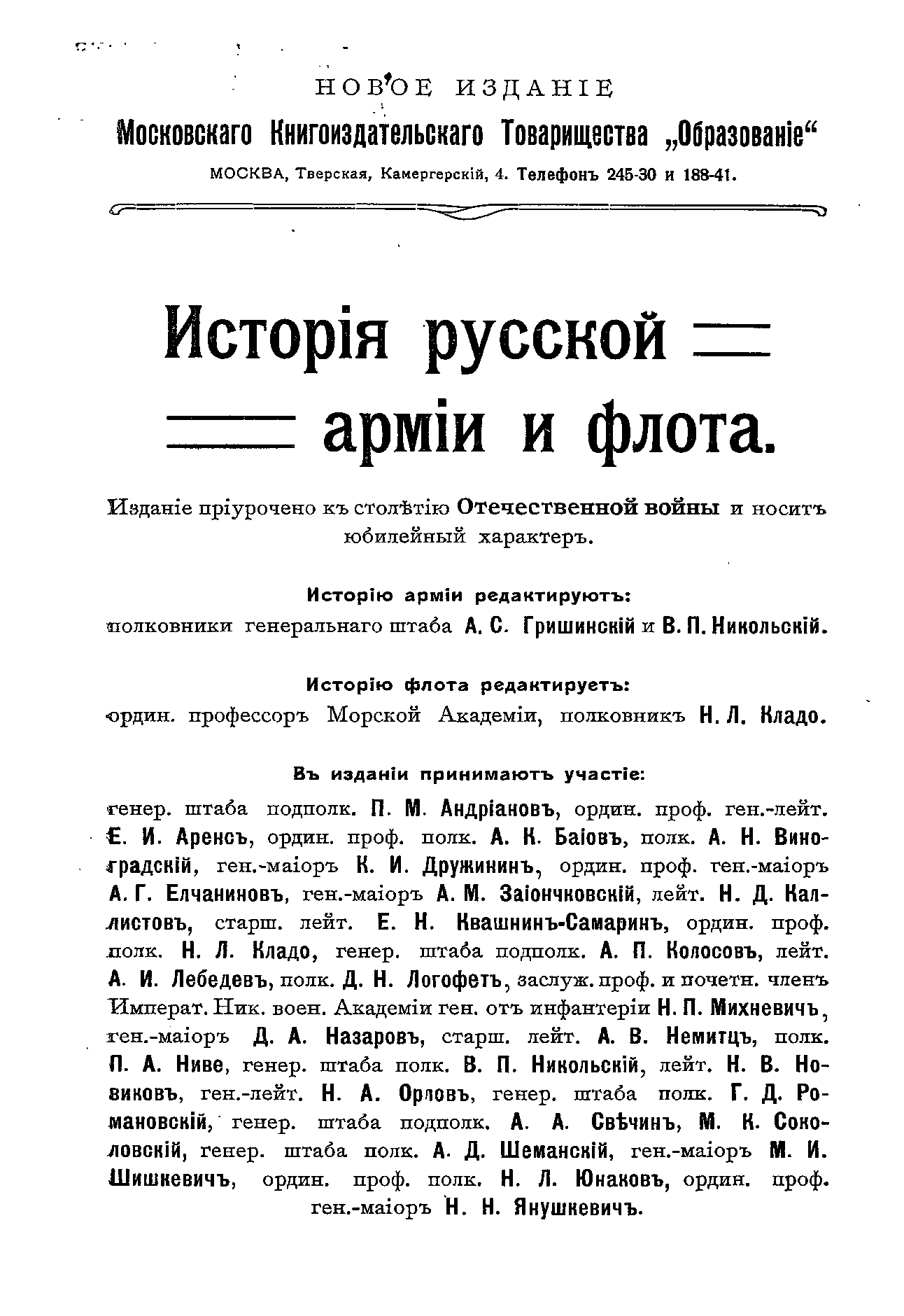 «История» рисует картину постепенного развития русского военного дела. С особым вниманием издание останавливается на наиболее выдающихся боевых эпизодах, интересуясь в тоже время организацией, бытом, вооружением и боевой подготовкой наших войск, в связи с политической жизнью государства. «История русской армии и флота» по своим размерам ( до 170 печатных листов) значительно превосходит прежние издания этого рода. Снабженная большим количеством иллюстраций и фотографий, она предназначалась для просвещения и русского офицерства, и русского общества.