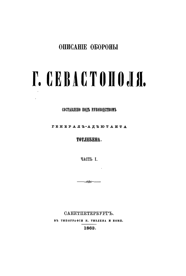 Полный обзор средств воюющих держав, полуострова Крыма, в особенности театра военных действий, изложенный по дням ход обороны и атаки, действия противников, а также распоряжения относительно убыли и усиления крымской армии, продовольствия войск и попечения больных и раненных, планы и чертежи.