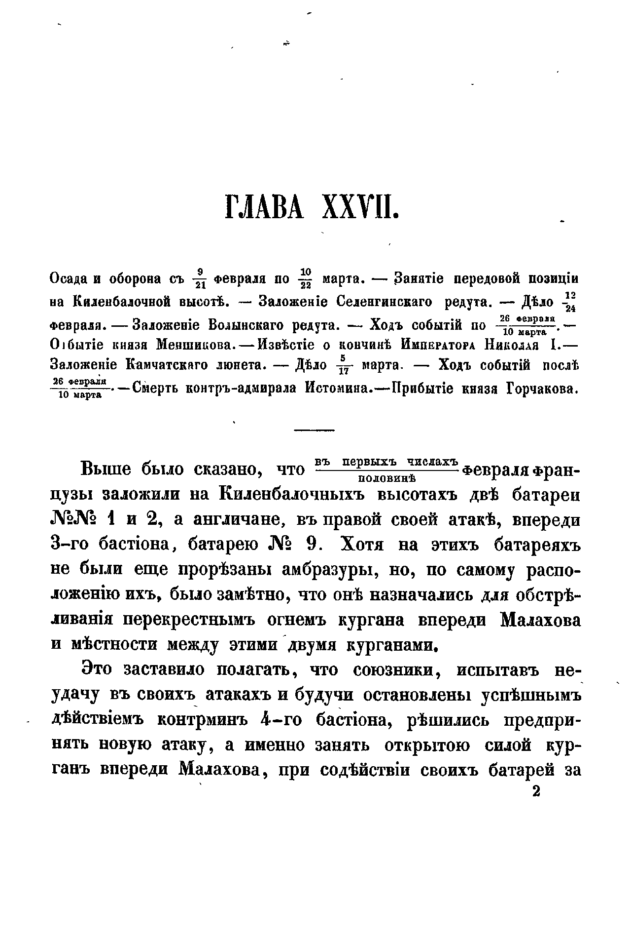 Полный обзор средств воюющих держав, полуострова Крыма, в особенности театра военных действий, изложенный по дням ход обороны и атаки, действия противников, а также распоряжения относительно убыли и усиления крымской армии, продовольствия войск и попечения больных и раненных, планы и чертежи.