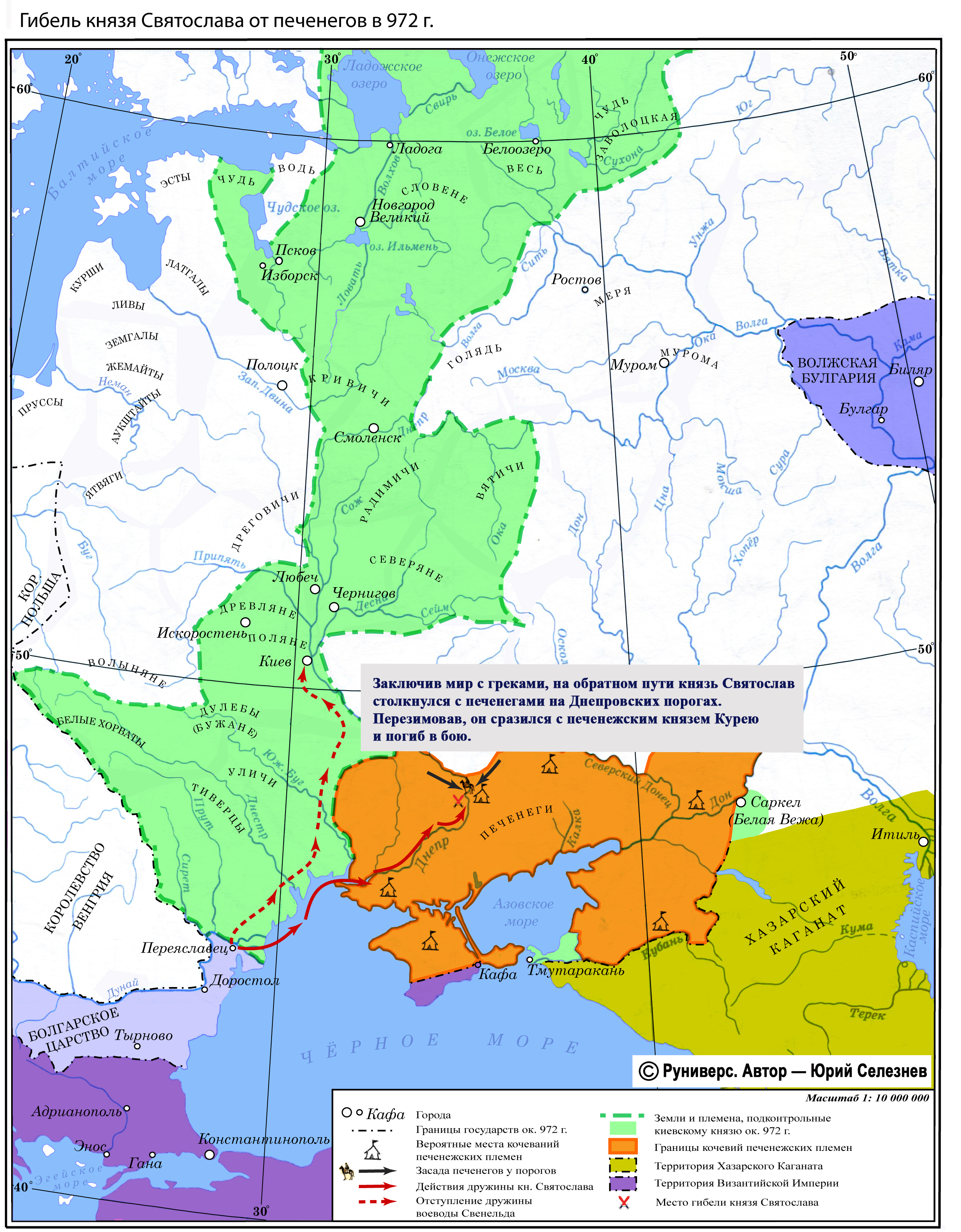 Заключив мир с греками, на обратном пути князь Святослав столкнулся с печенегами на днепровских порогах. Перезимовав, он сразился с печенежским князем Курею и погиб в бою.