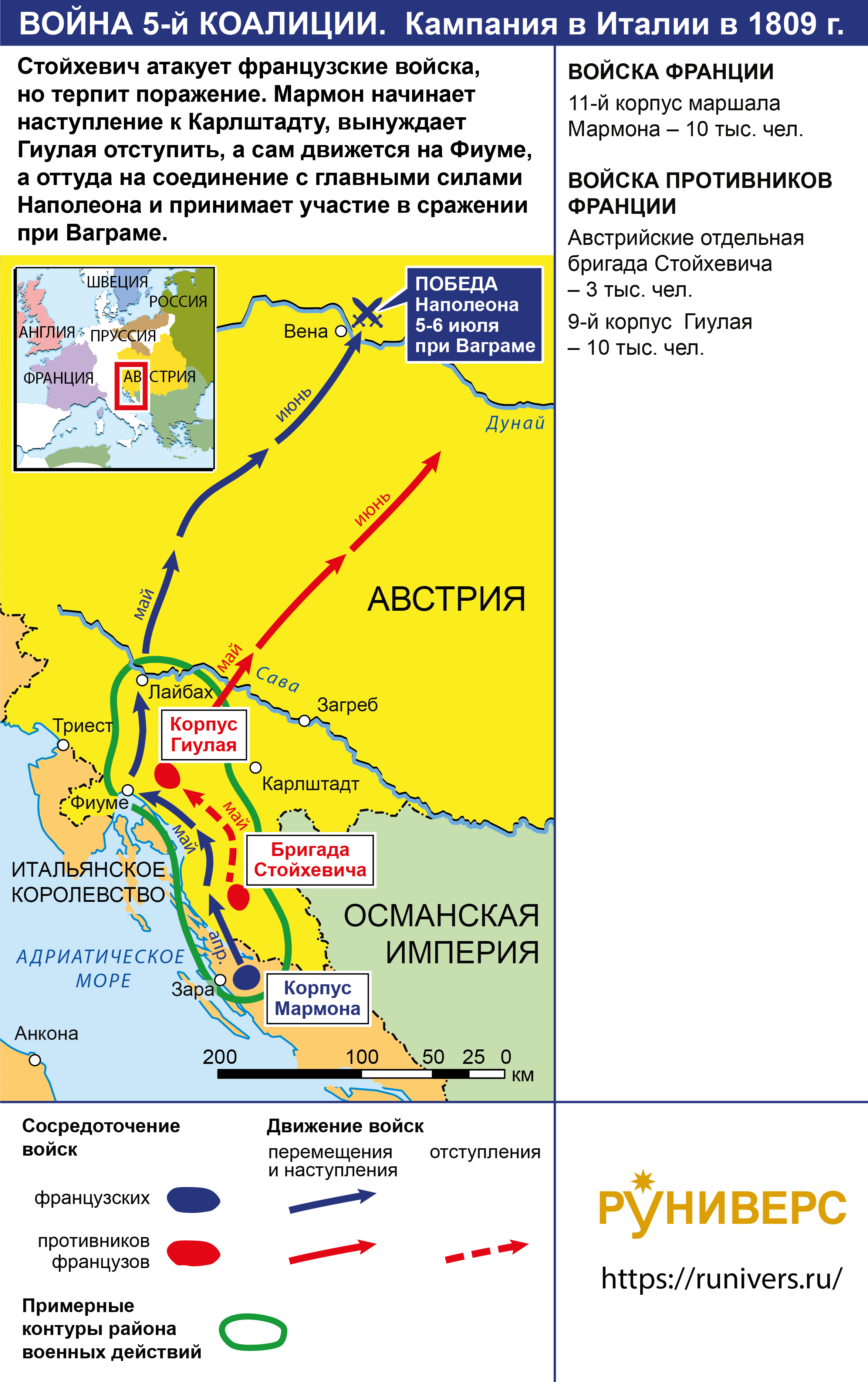 Война Пятой антифранцузской коалиции 1809 г. Кампания в Далмации, Италии и на Дунае в 1809 г.