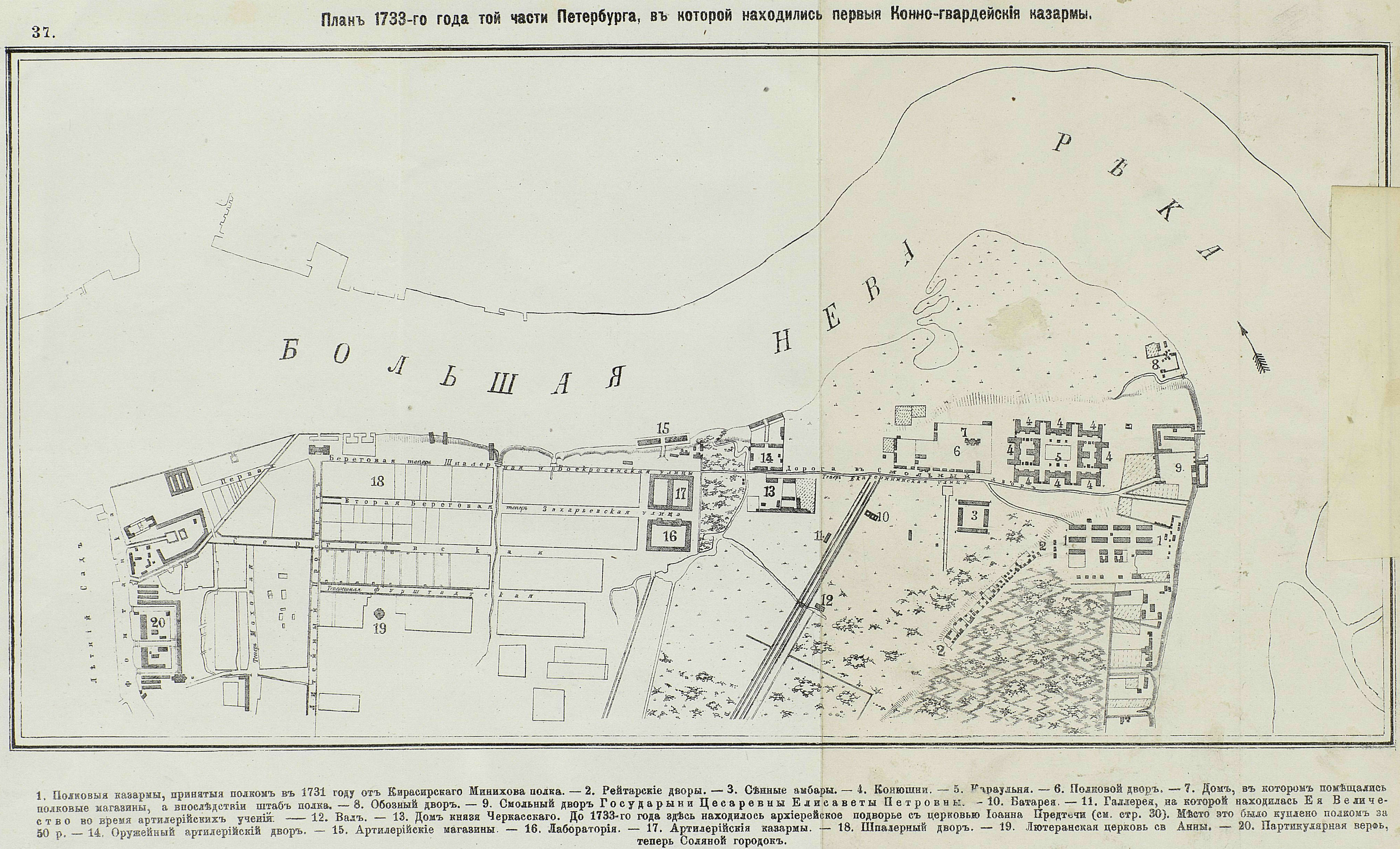 План 1733 года той части Петербурга, в которой находились первые Конно-гвардейские казармы
