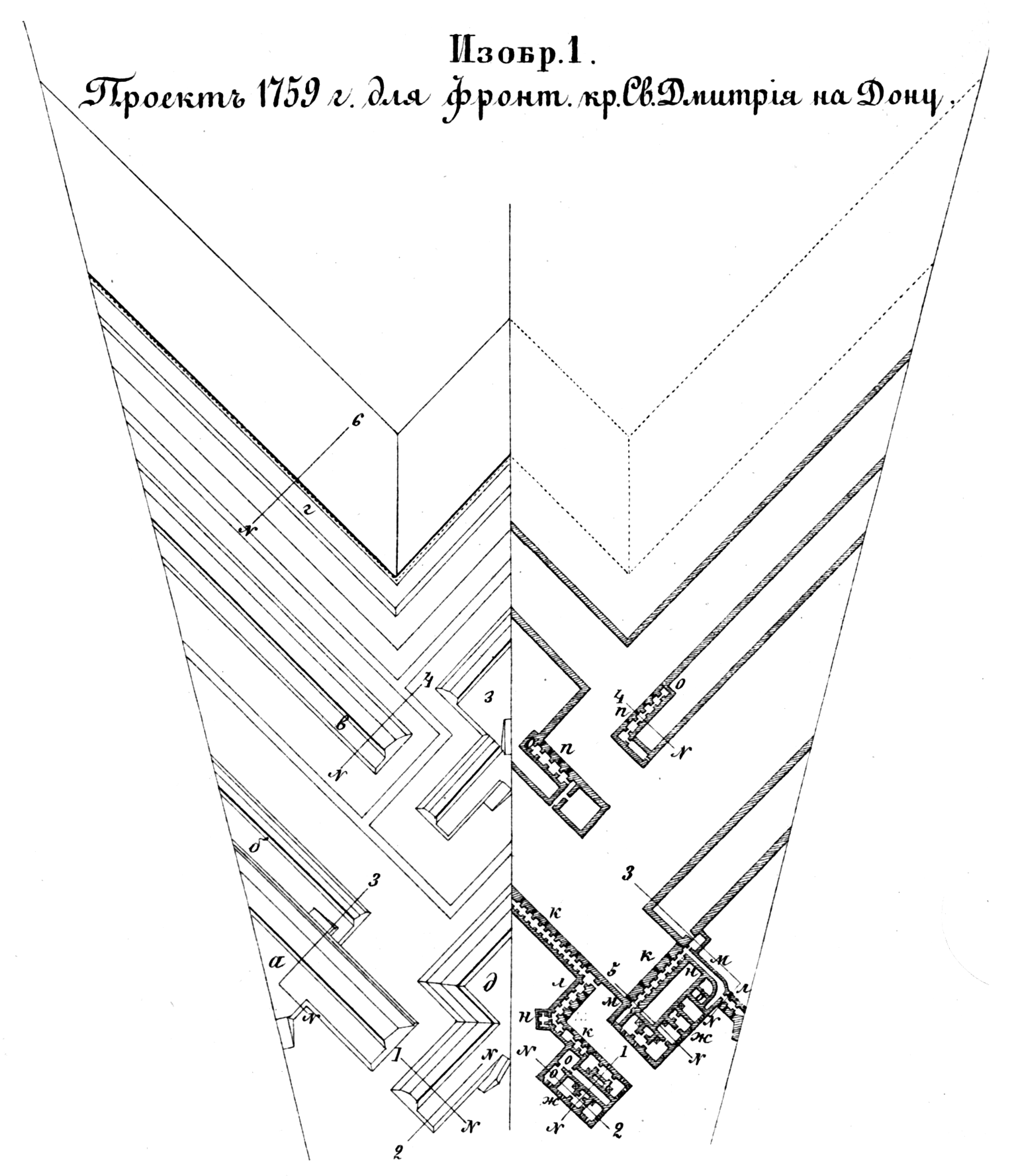Способы укрепления. Изобр.1. Проект 1759 года для фронтального укрепления крепости Святого Дмитрия на Дону