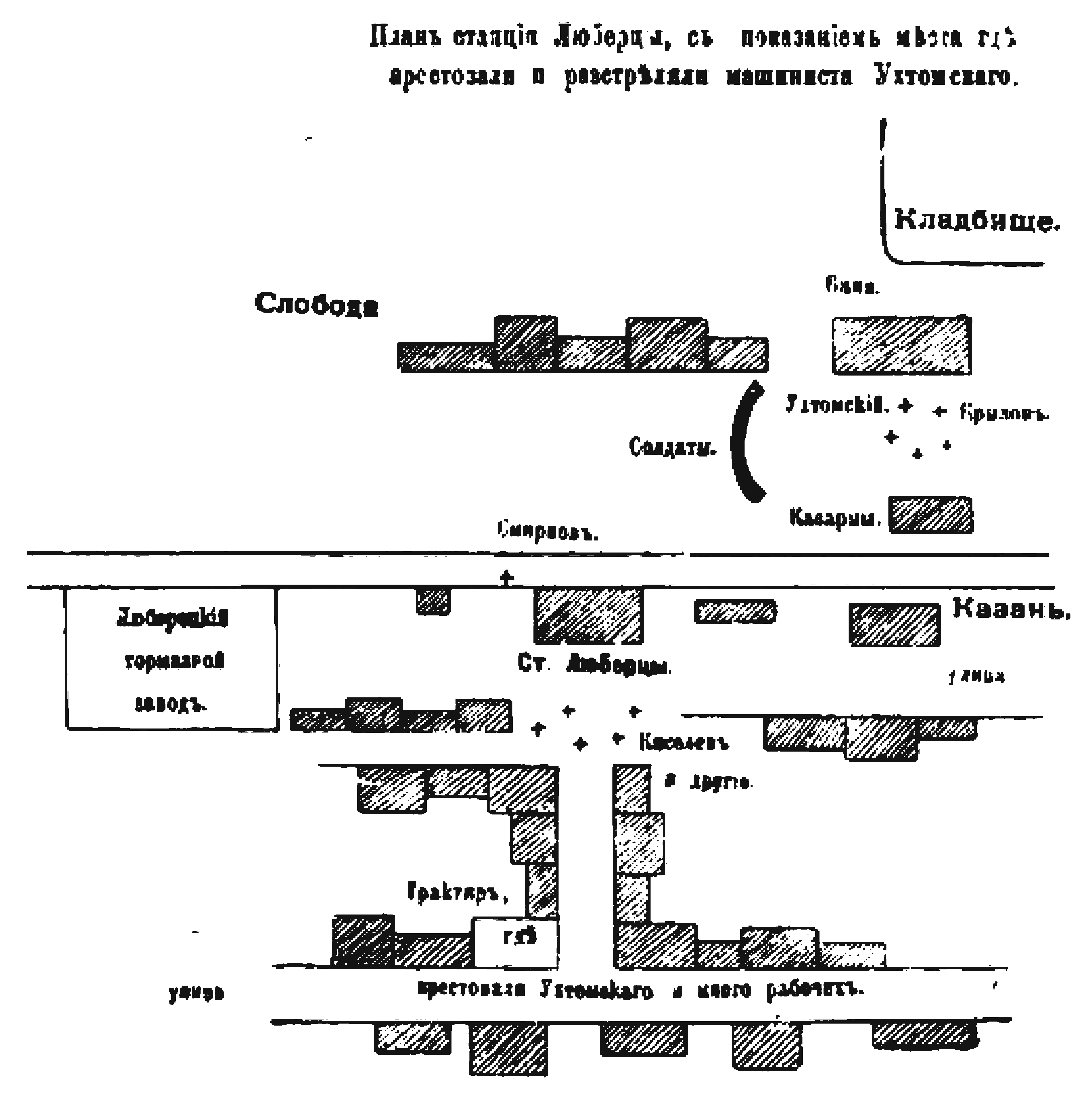 Станция Люберцы, с показанием места, где арестовали и расстреляли машиниста Ухтомского
