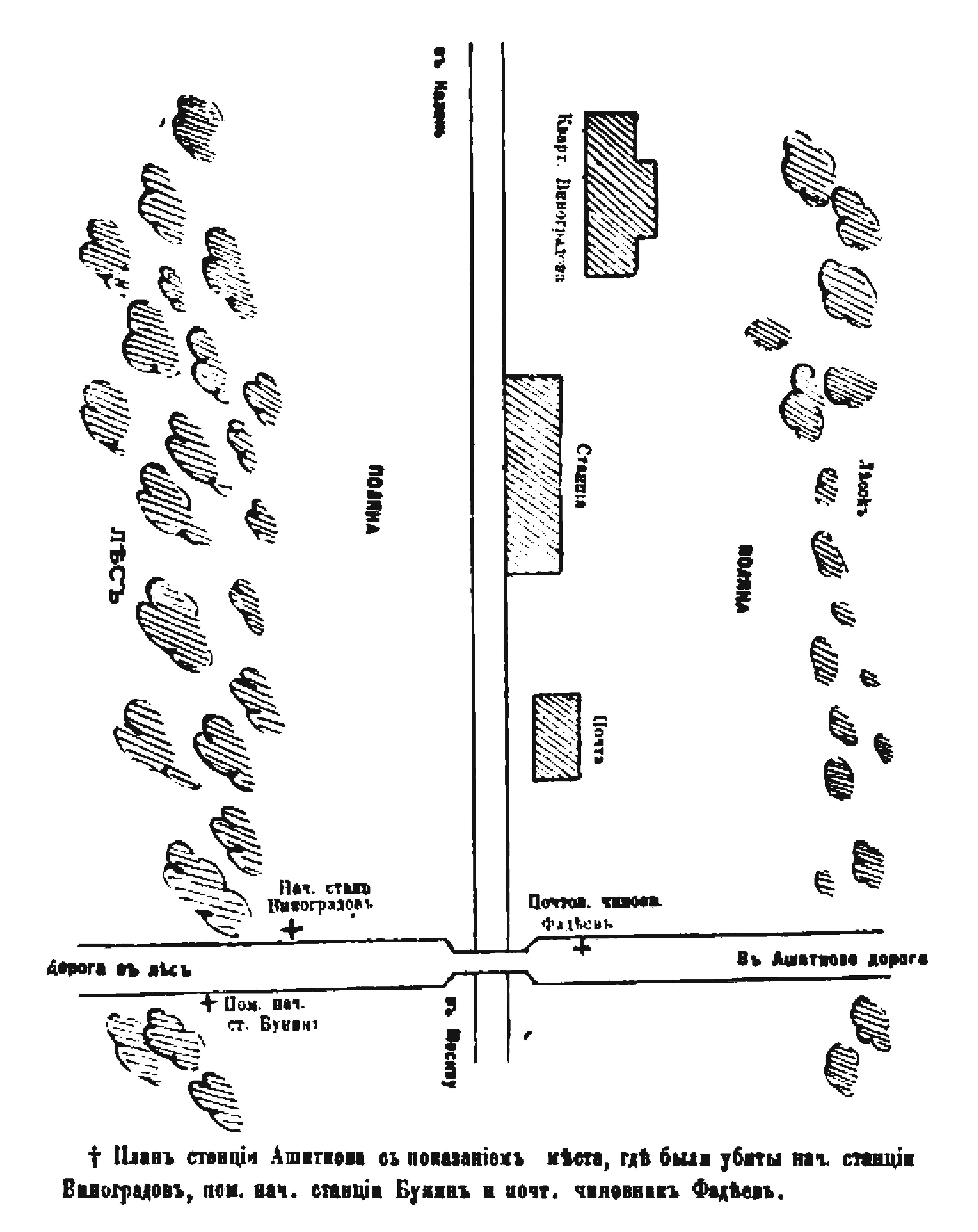 Станция Ашитково с показанием места, где были убиты начальник станции Виноградов, помощник начальника станции Бунин и почтовый чиновник Фадеев