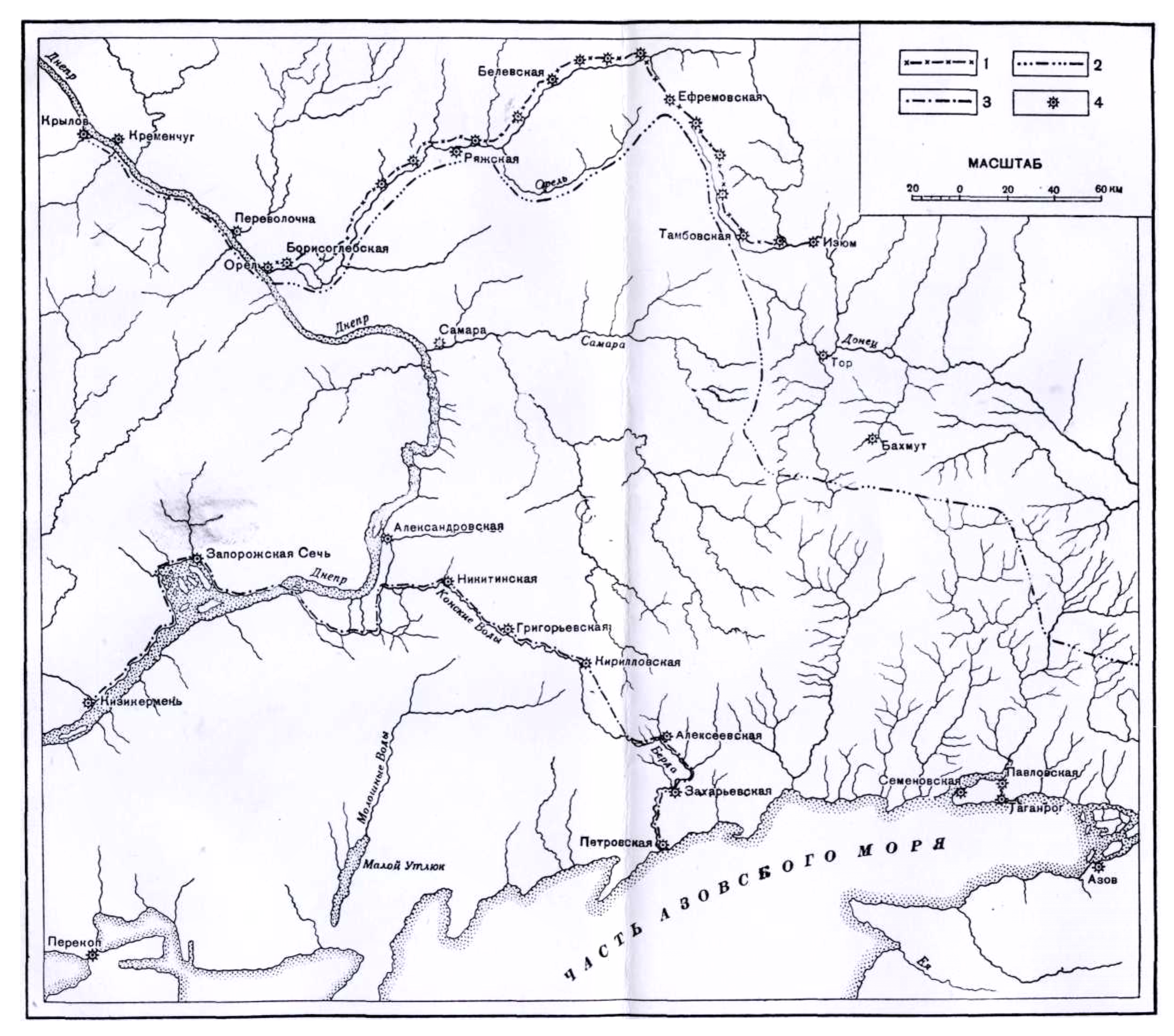 Русско-турецкая граница по рекам Берде и Конским Водам с укреплениями 1770 годов. Чертеж выполнен по рукописной карте XVIII века (Центральный Государственный военно-исторический архив)