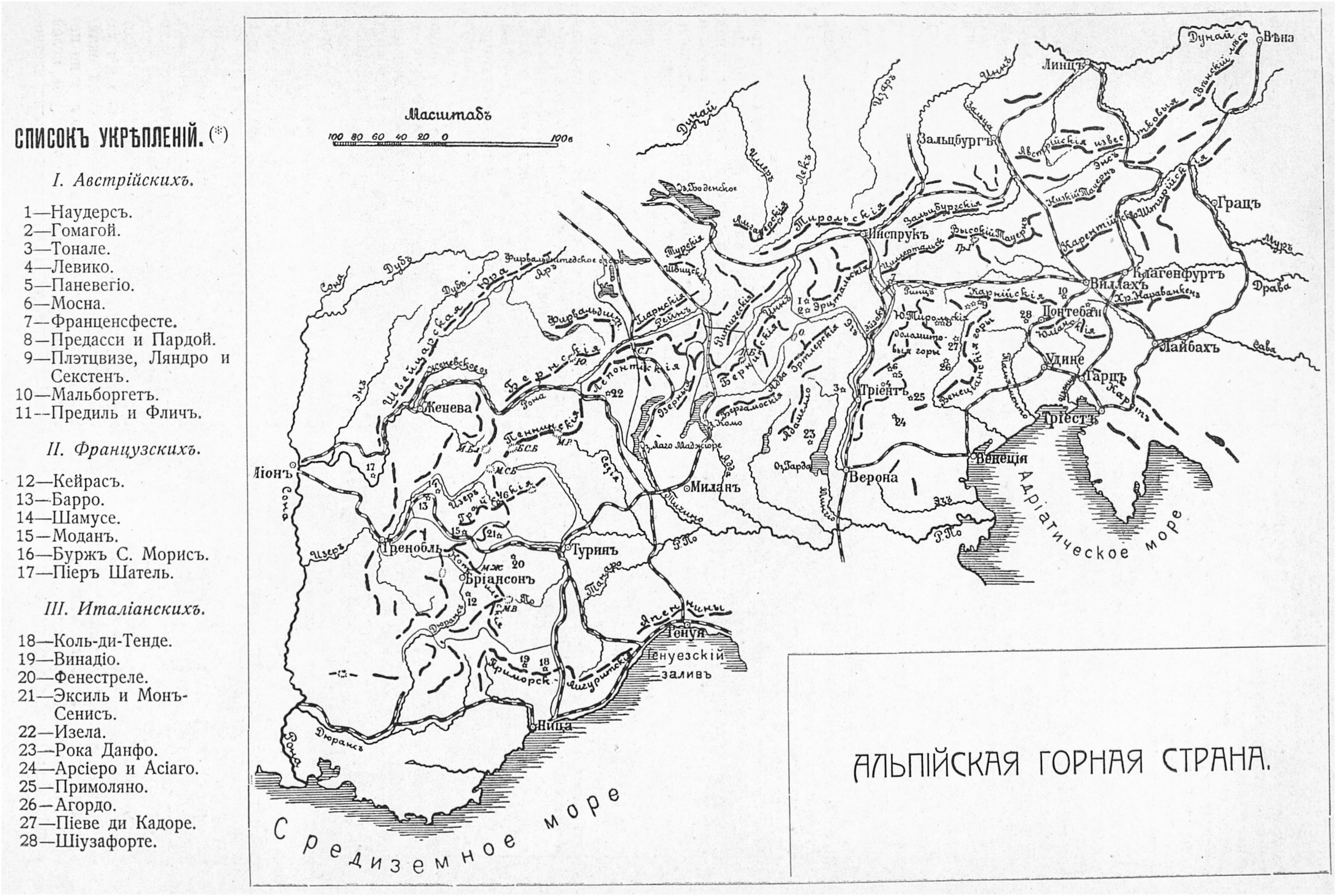 Альпийская горная страна и расположение австрийских, французских и итальянских укреплений